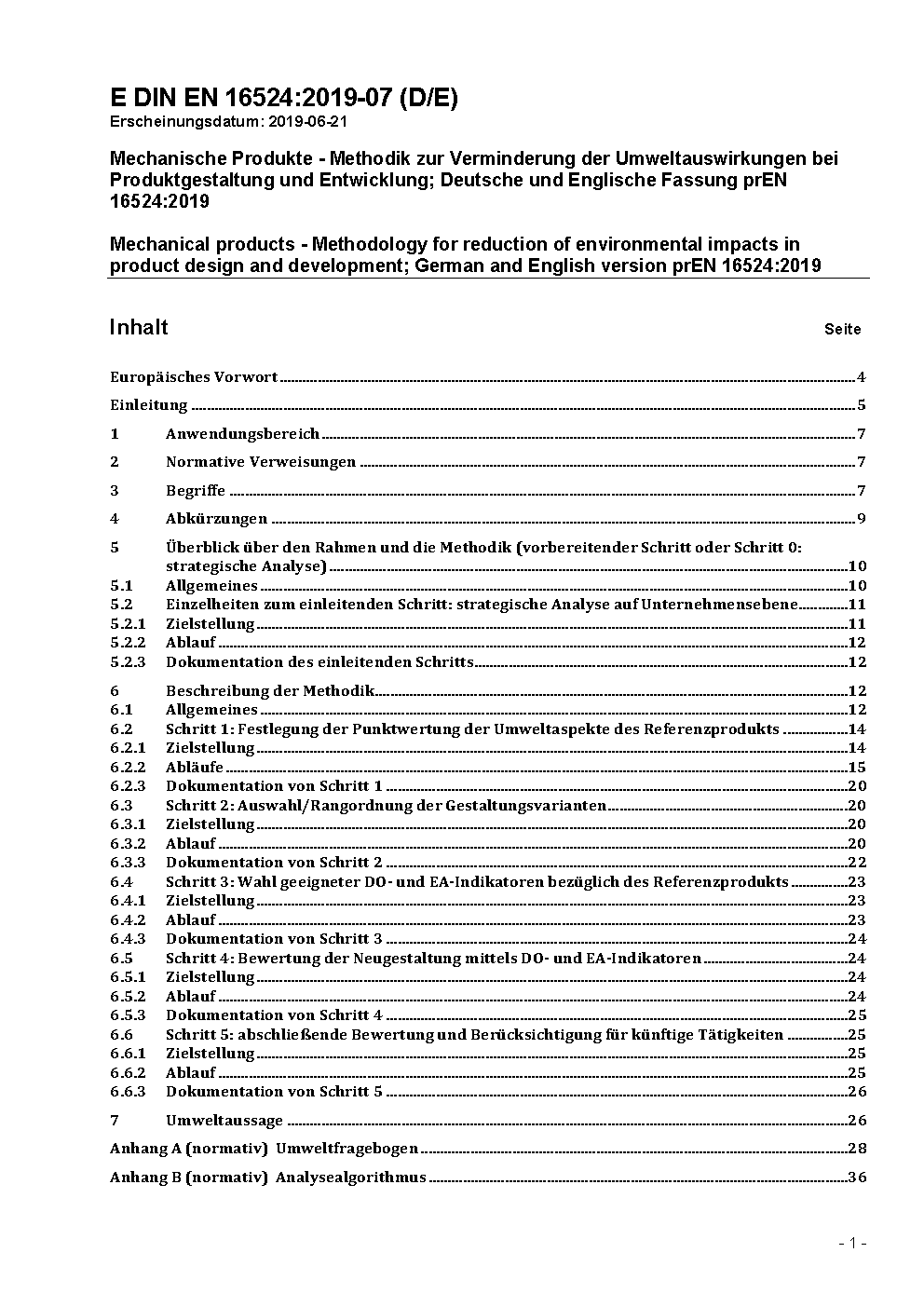 Mechanische Produkte - Methodik zur Verminderung der Umweltauswirkungen bei Produktgestaltung und Entwicklung; Deutsche und Englische Fassung prEN 16524:2019