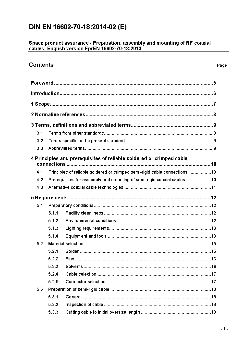 Raumfahrtproduktsicherung - Vorbereitung, Zusammenbau und Befestigung von RF-Koaxial-Kabeln; Englische Fassung FprEN 16602-70-18:2013