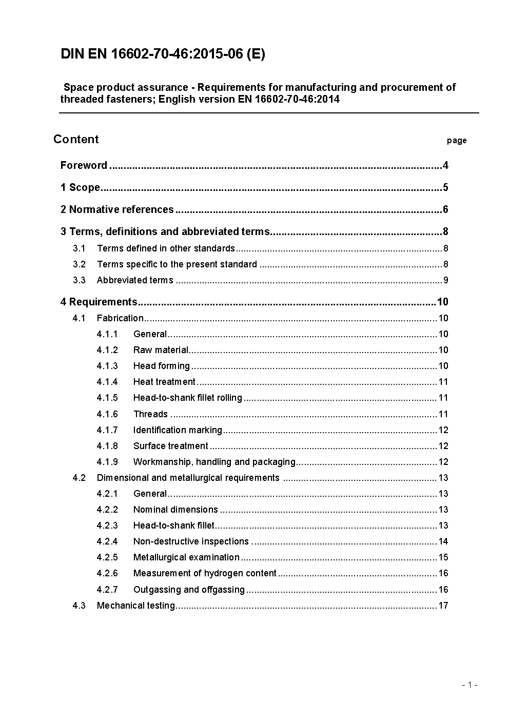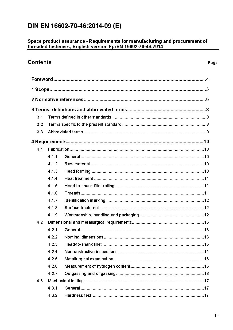 Space product assurance - Requirements for manufacturing and procurement of threaded fasteners; English version EN 16602-70-46:2014