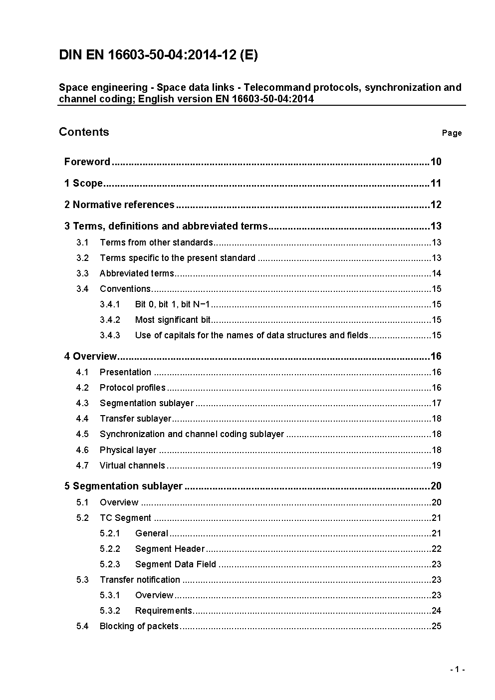 Raumfahrttechnik - Raumfahrt-Datenübertragung - Telekommando-Protokolle, -synchronisation und -kanalkodierung; Englische Fassung EN 16603-50-04:2014