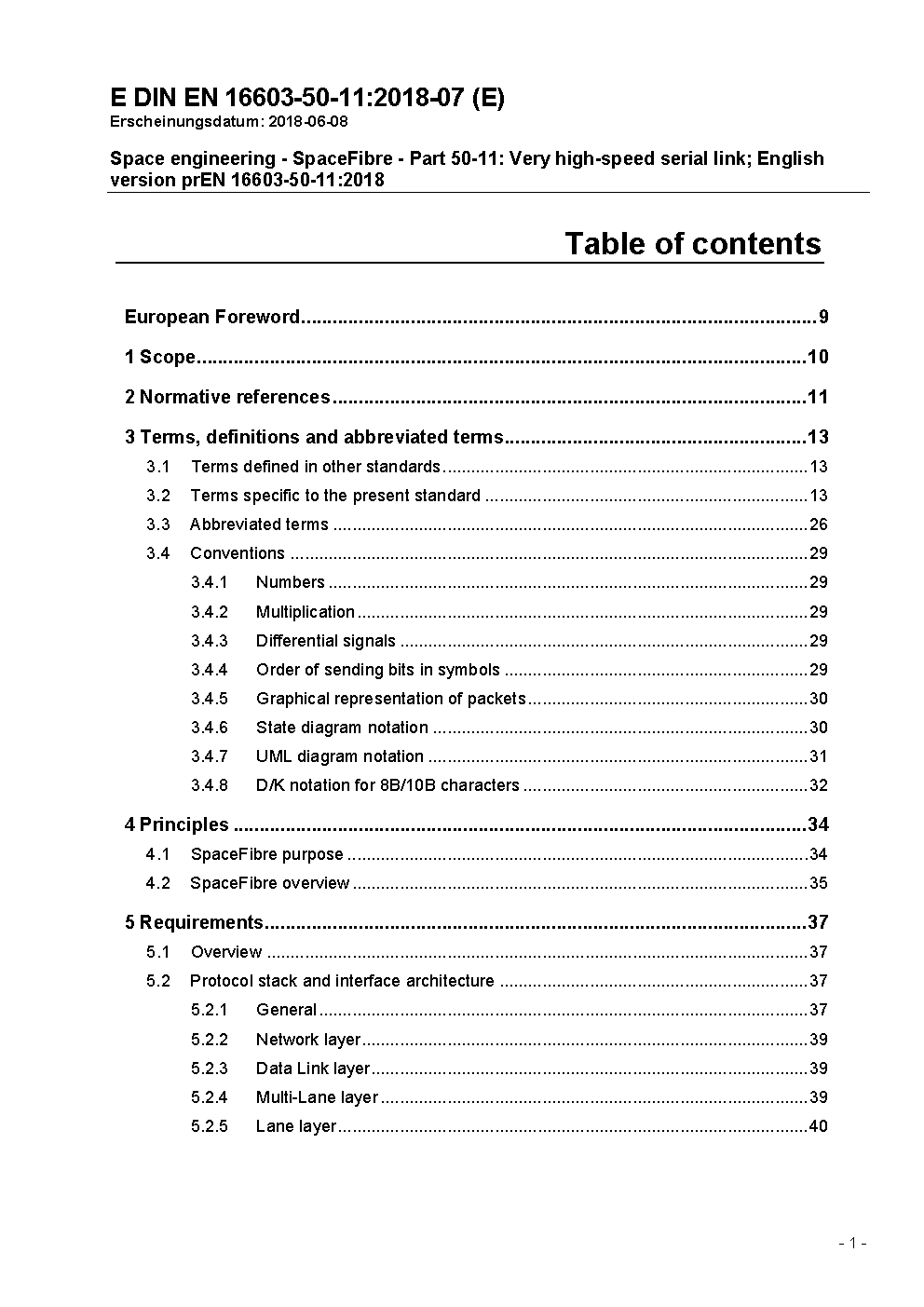 Raumfahrttechnik - SpaceFibre - Teil 50-11: Sehr schnelle serielle Schnittstelle; Englische Fassung prEN 16603-50-11:2018