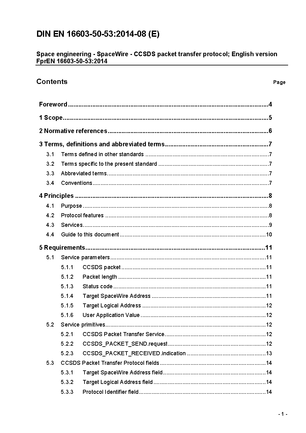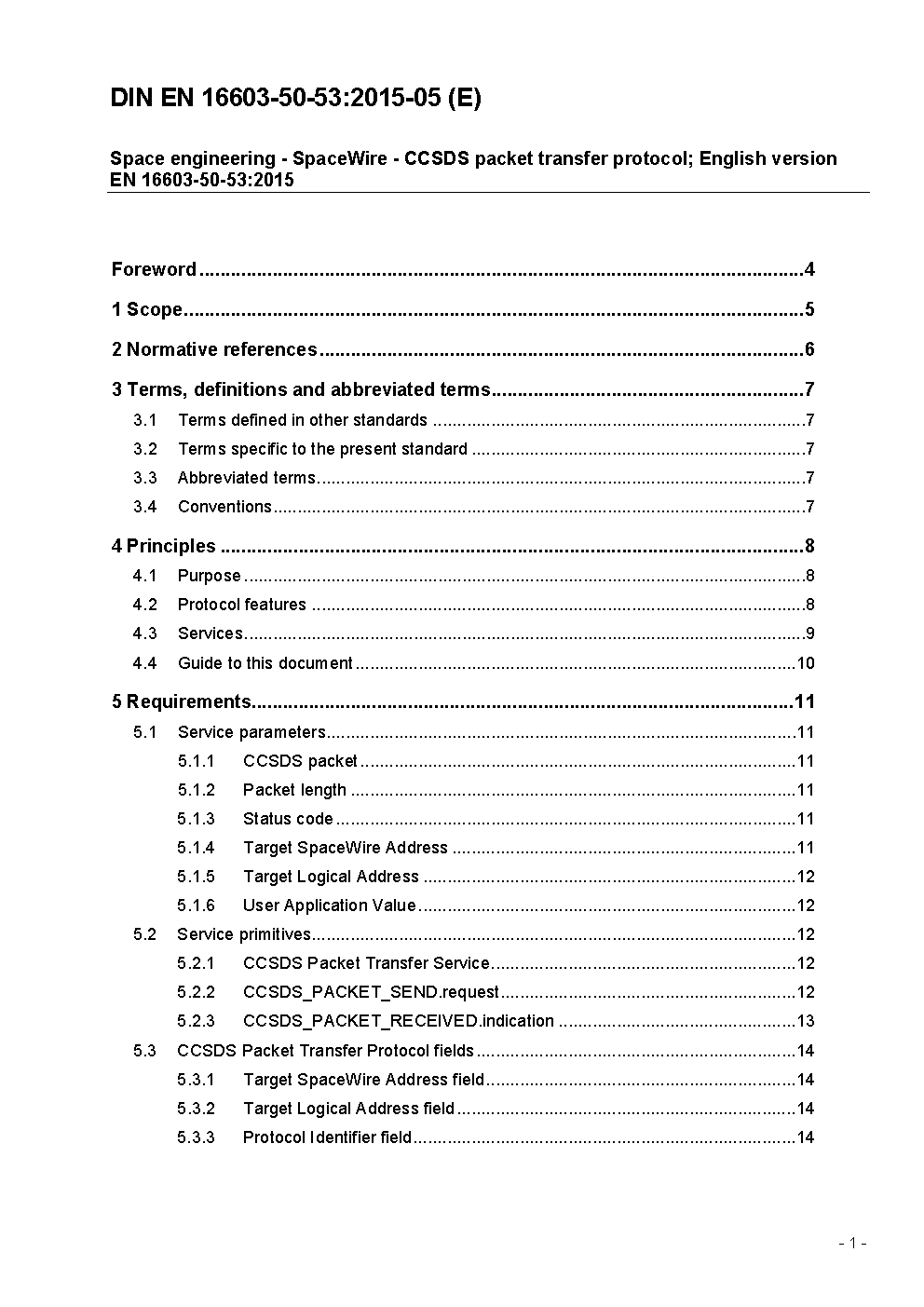 Space engineering - SpaceWire - CCSDS packet transfer protocol; English version EN 16603-50-53:2015