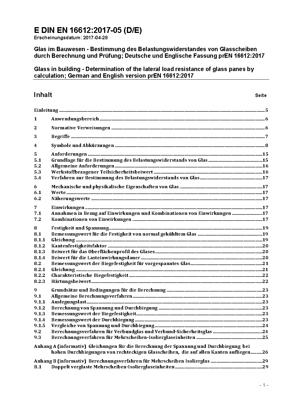 Glas im Bauwesen - Bestimmung des Belastungswiderstandes von Glasscheiben durch Berechnung und Prüfung; Deutsche und Englische Fassung prEN 16612:2017
