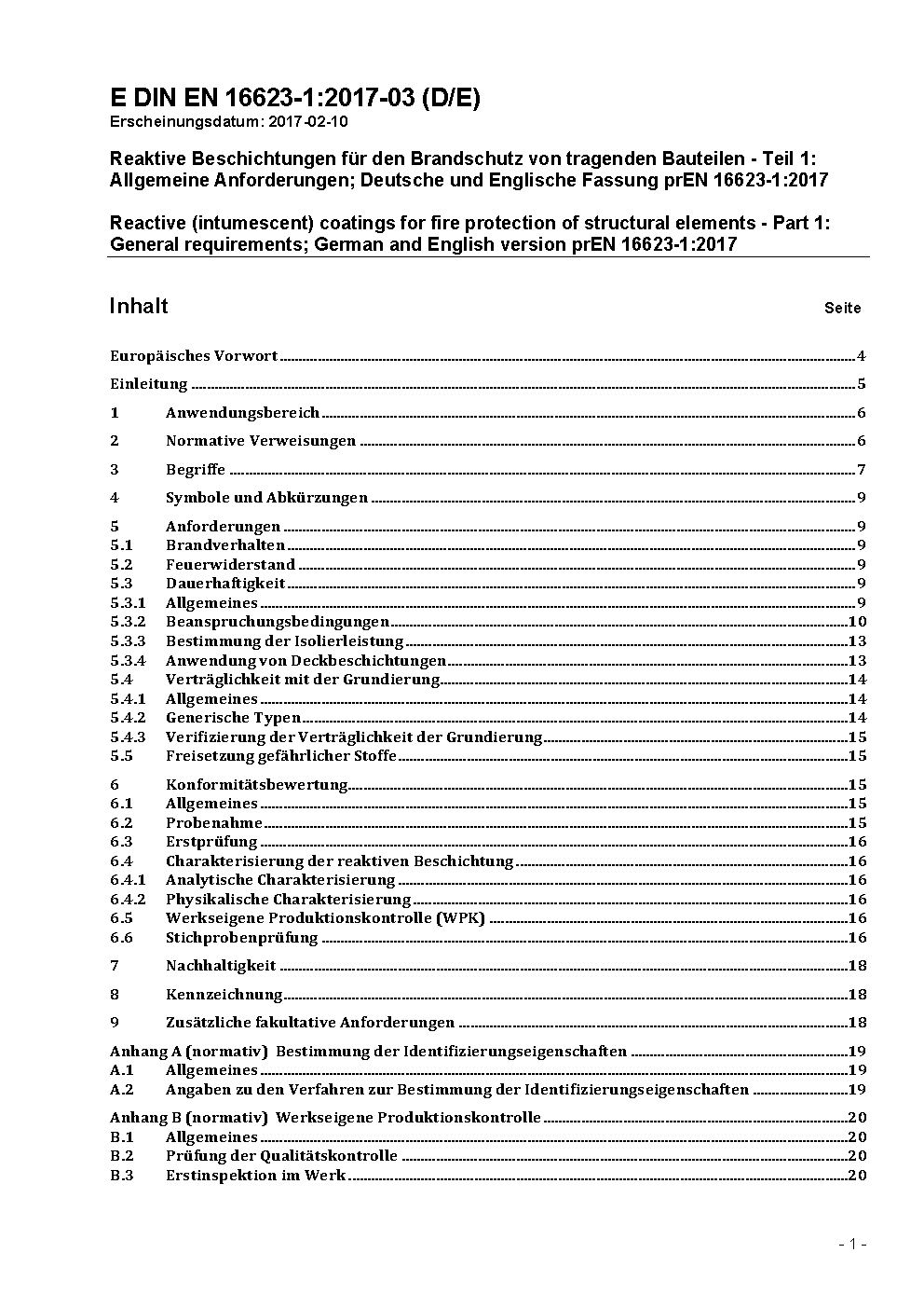 Reaktive Beschichtungen für den Brandschutz von tragenden Bauteilen - Teil 1: Allgemeine Anforderungen; Deutsche und Englische Fassung prEN 16623-1:2017