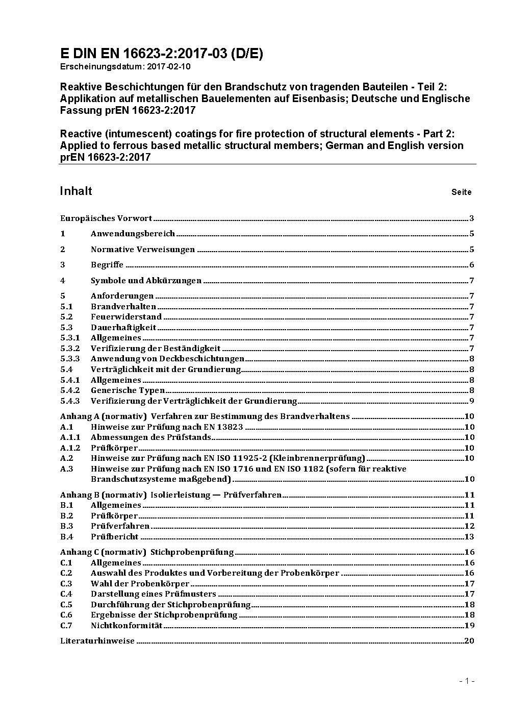 Reaktive Beschichtungen für den Brandschutz von tragenden Bauteilen - Teil 2: Applikation auf metallischen Bauelementen auf Eisenbasis; Deutsche und Englische Fassung prEN 16623-2:2017 / Achtung: Gilt in Verbindung mit DIN EN 16623-1 (2017-03)
