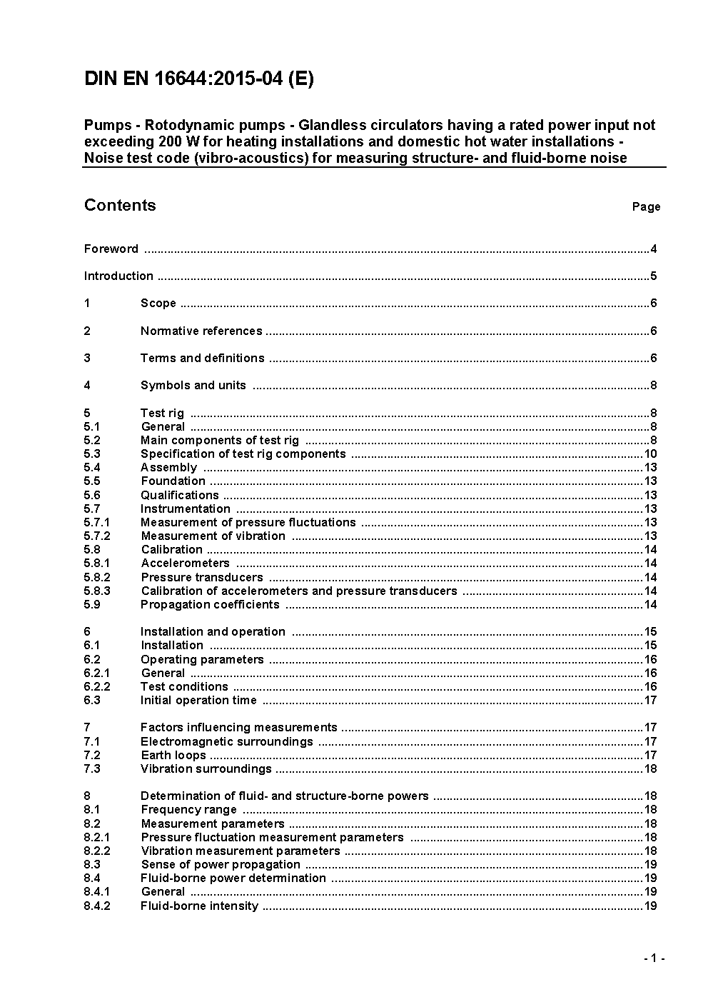 Pumps - Rotodynamic pumps - Glandless circulators having a rated power input not exceeding 200 W for heating installations and domestic hot water installations - Noise test code (vibro-acoustics) for measuring structure- and fluid-borne noise; German version EN 16644:2014