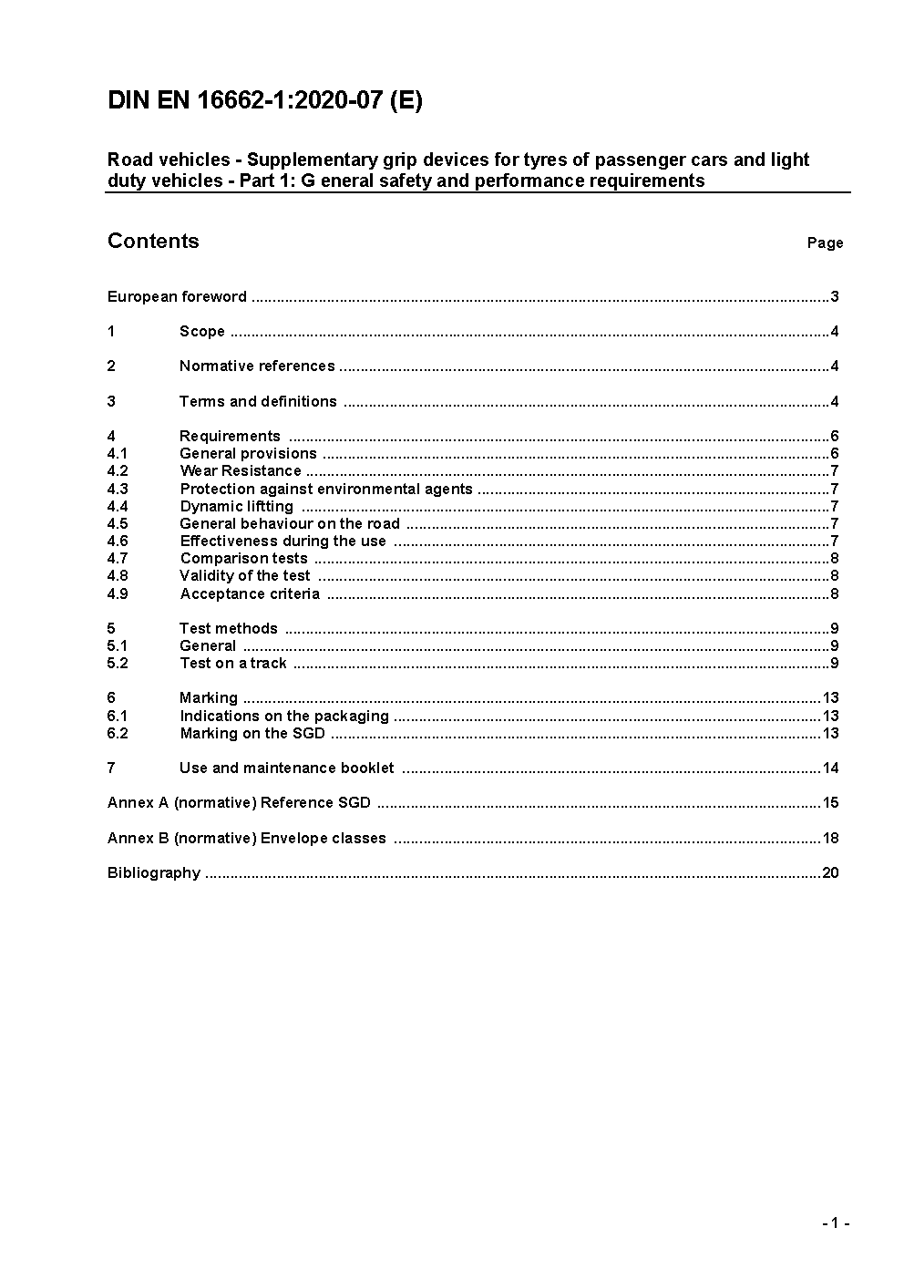Road vehicles - Supplementary grip devices for tyres of passenger cars and light duty vehicles - Part 1: General safety and performance requirements; German version EN 16662-1:2020