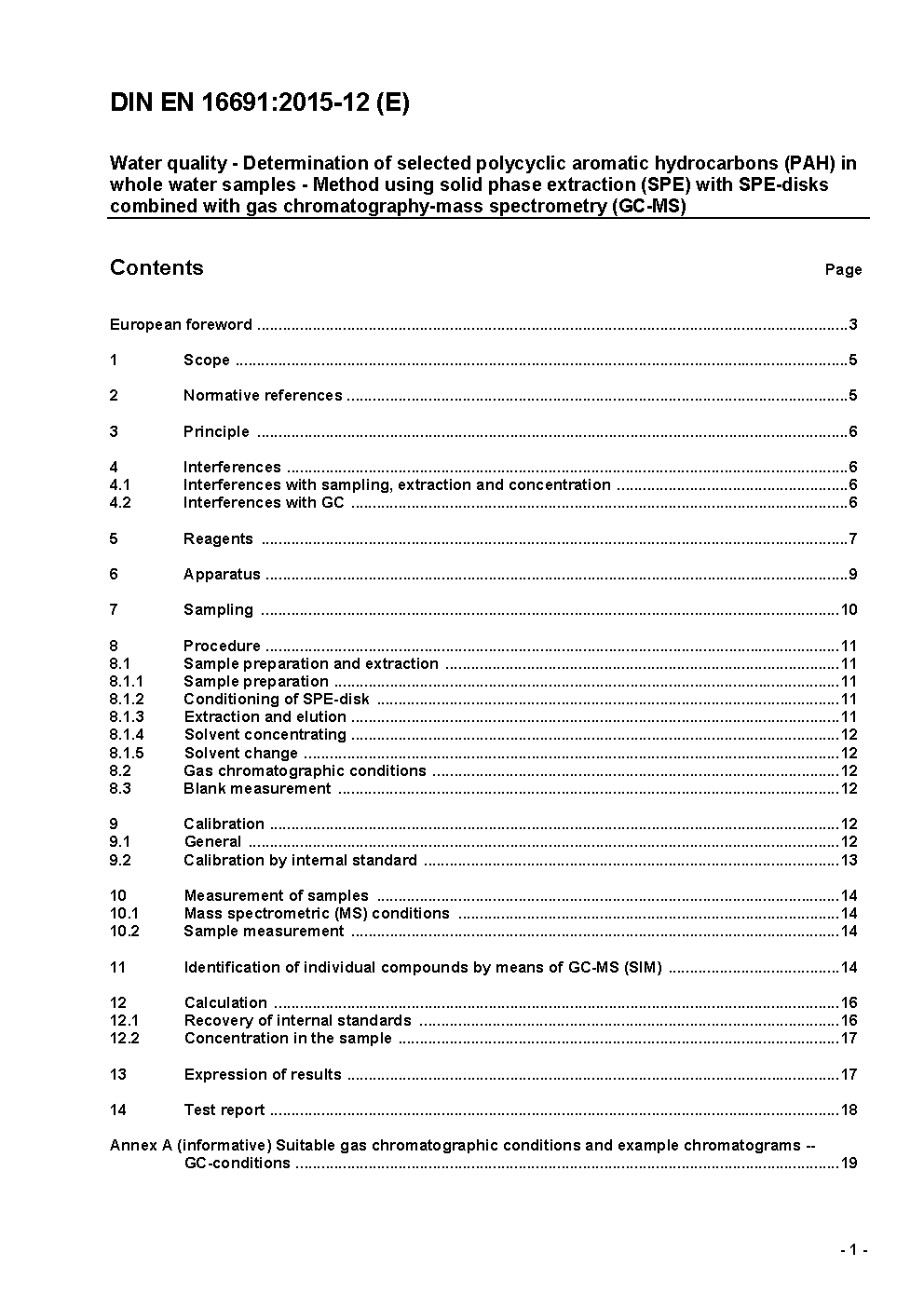 Water quality - Determination of selected polycyclic aromatic hydrocarbons (PAH) in whole water samples - Method using solid phase extraction (SPE) with SPE-disks combined with gas chromatography-mass spectrometry (GC-MS); German version EN 16691:2015