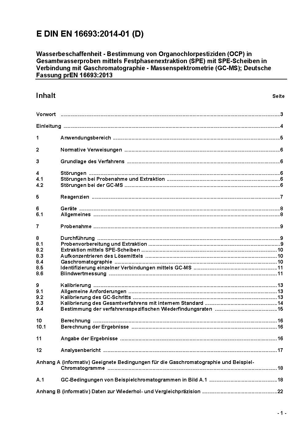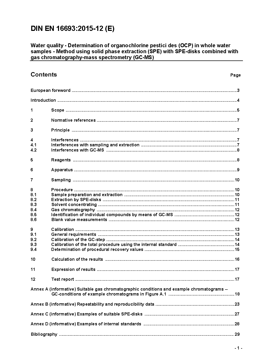 Wasserbeschaffenheit - Bestimmung von Organochlorpestiziden (OCP) in Gesamtwasserproben - Verfahren mittels Festphasenextraktion (SPE) mit SPE-Disks in Verbindung mit Gaschromatographie-Massenspektrometrie (GC-MS); Deutsche Fassung EN 16693:2015
