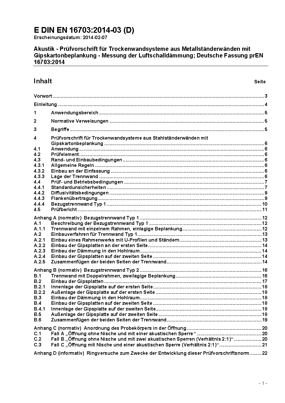 Akustik - Prüfvorschrift für Trockenwandsysteme aus Metallständerwänden mit Gipsplattenbeplankung - Messung der Luftschalldämmung; Deutsche Fassung EN 16703:2015