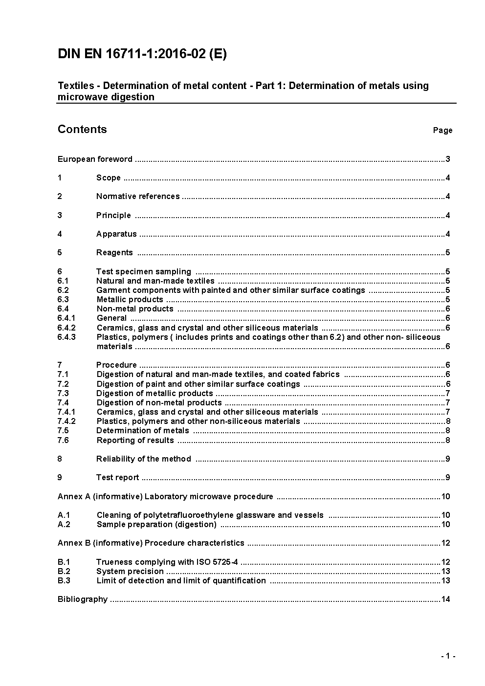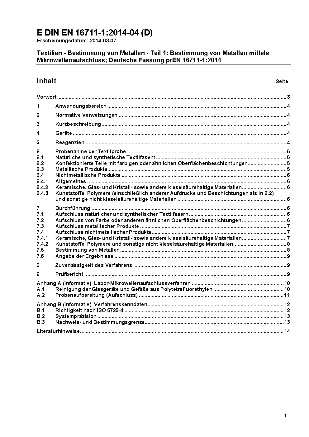 Textilien - Bestimmung von Metallen - Teil 1: Bestimmung von Metallen mittels Mikrowellenaufschluss; Deutsche Fassung prEN 16711-1:2014