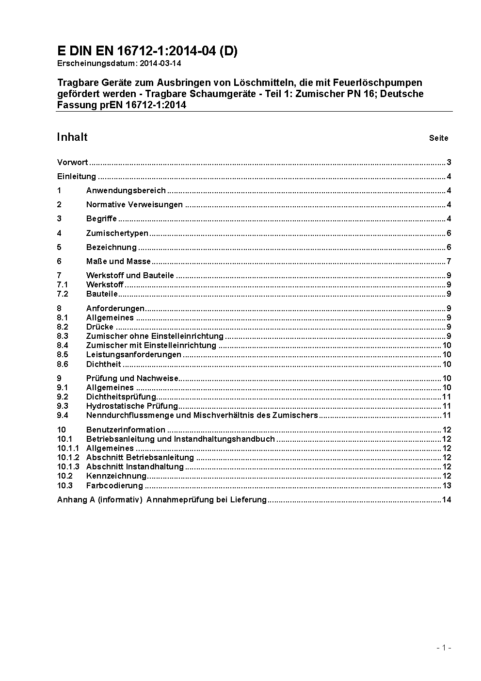 Tragbare Geräte zum Ausbringen von Löschmitteln, die mit Feuerlöschpumpen gefördert werden - Tragbare Schaumgeräte - Teil 1: Zumischer PN 16; Deutsche Fassung prEN 16712-1:2014