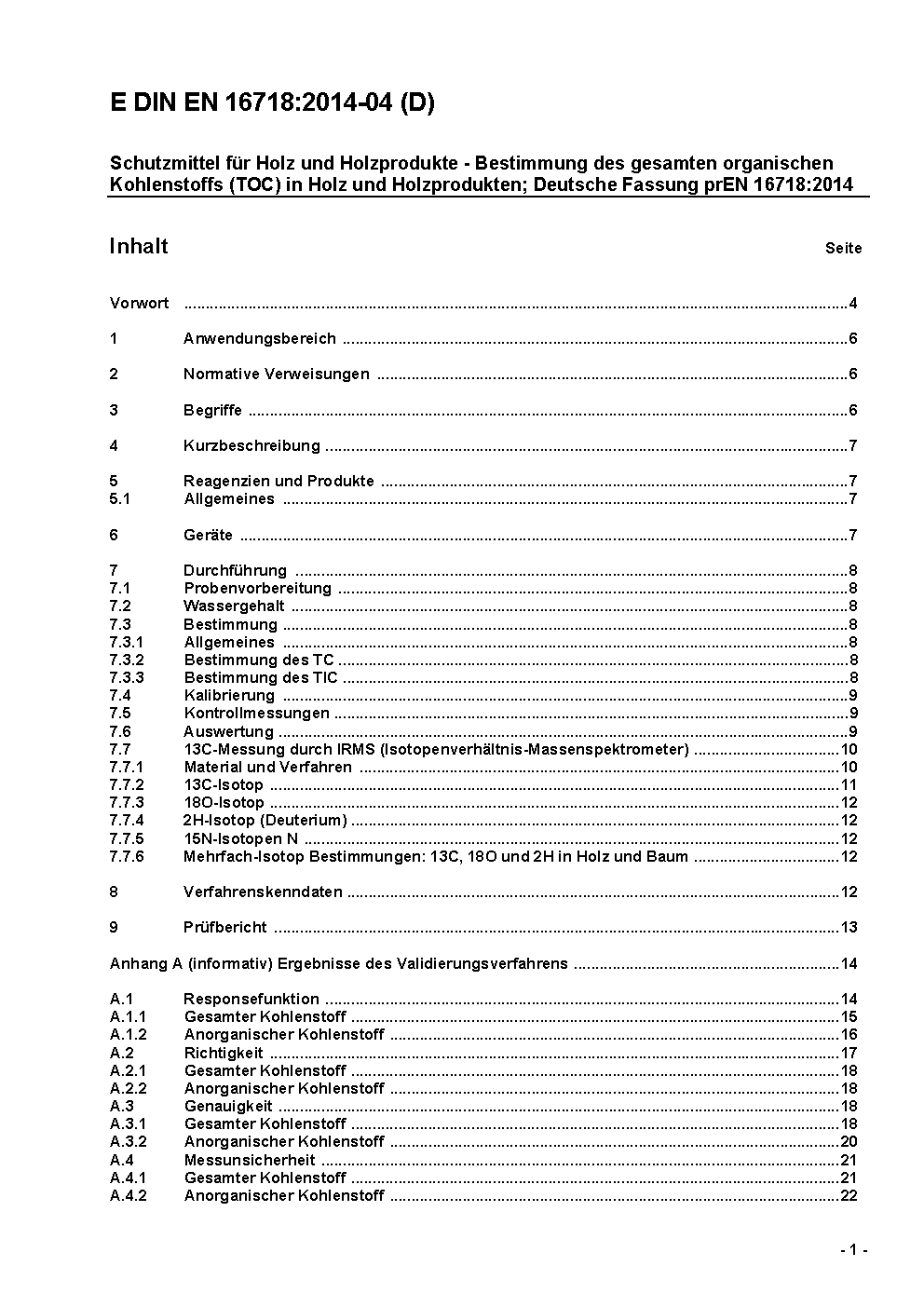 Holz und Holzprodukte - Bestimmung des gesamten organischen Kohlenstoffs (TOC) in Holz und Holzprodukten; Deutsche Fassung EN 16718:2015