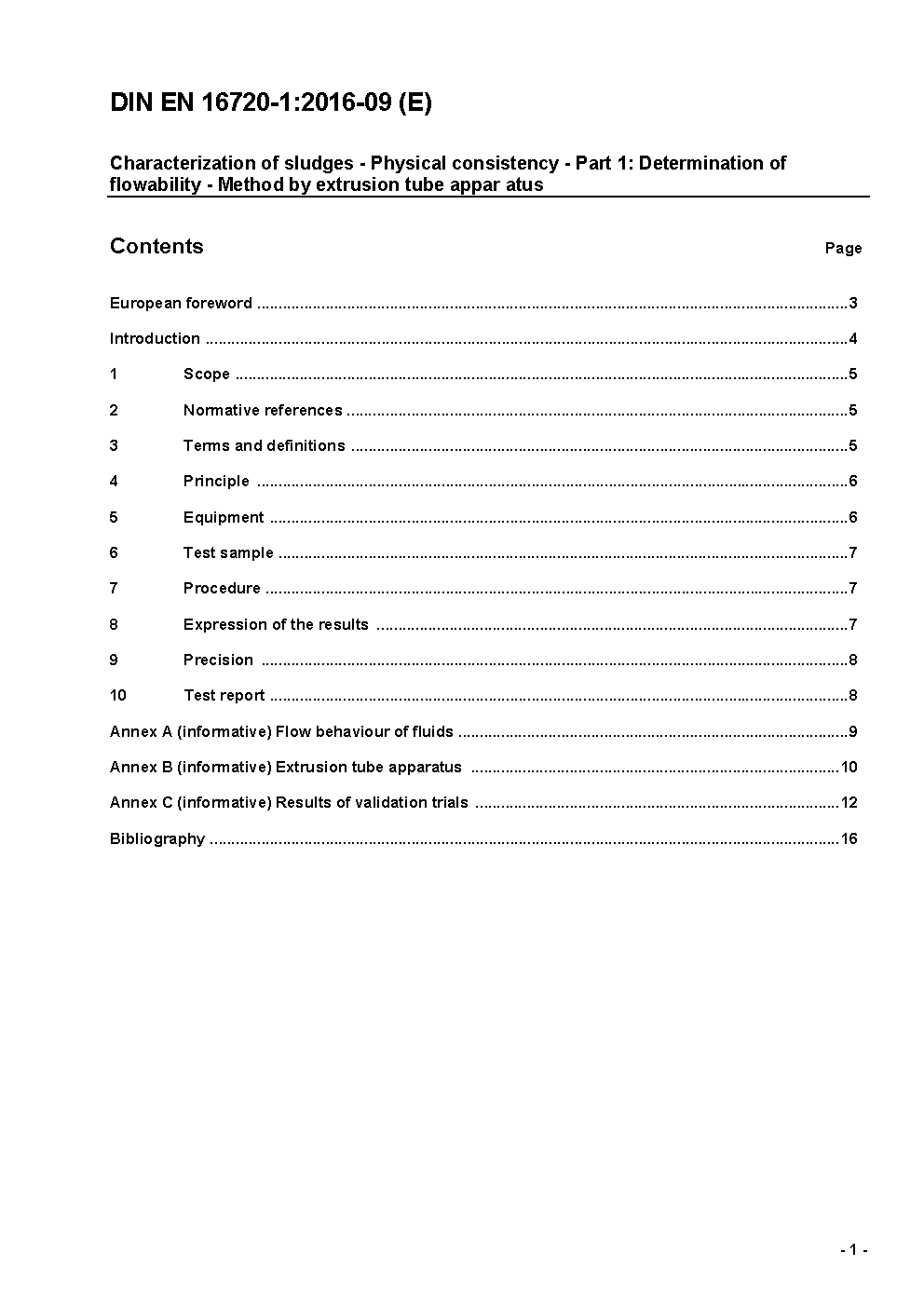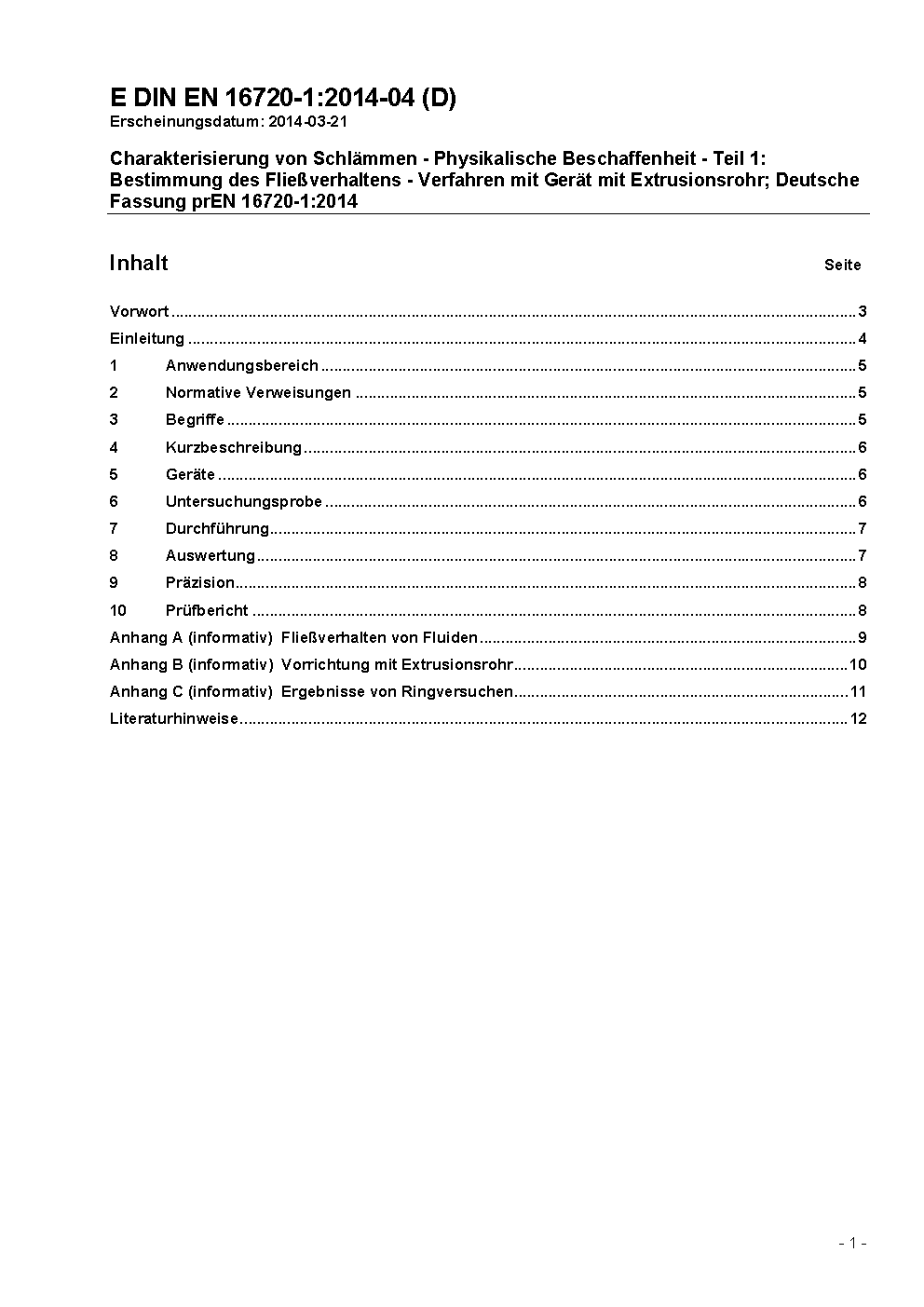 Charakterisierung von Schlämmen - Physikalische Beschaffenheit - Teil 1: Bestimmung des Fließverhaltens - Verfahren mit Gerät mit Extrusionsrohr; Deutsche Fassung prEN 16720-1:2014