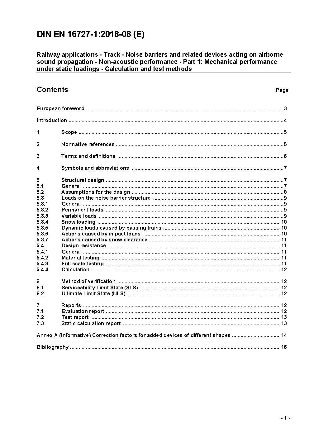 Bahnanwendungen - Oberbau - Lärmschutzwände und verwandte Vorrichtungen zur Beeinflussung der Luftschallausbreitung - Nicht akustische Eigenschaften - Teil 1: Mechanische Eigenschaftsanforderungen unter statischen Belastungen - Berechnungs- und Prüfverfahren; Deutsche Fassung EN 16727-1:2018