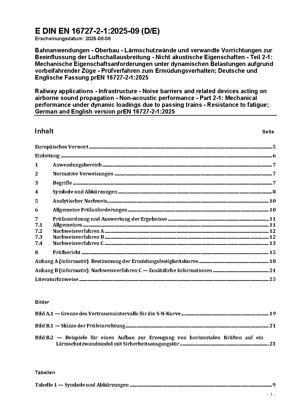 Bahnanwendungen - Oberbau - Lärmschutzwände und verwandte Vorrichtungen zur Beeinflussung der Luftschallausbreitung - Nicht akustische Eigenschaften - Teil 2-1: Mechanische Eigenschaftsanforderungen unter dynamischen Belastungen aufgrund vorbeifahrender Züge - Prüfverfahren zum Ermüdungsverhalten; Deutsche Fassung EN 16727-2-1:2018