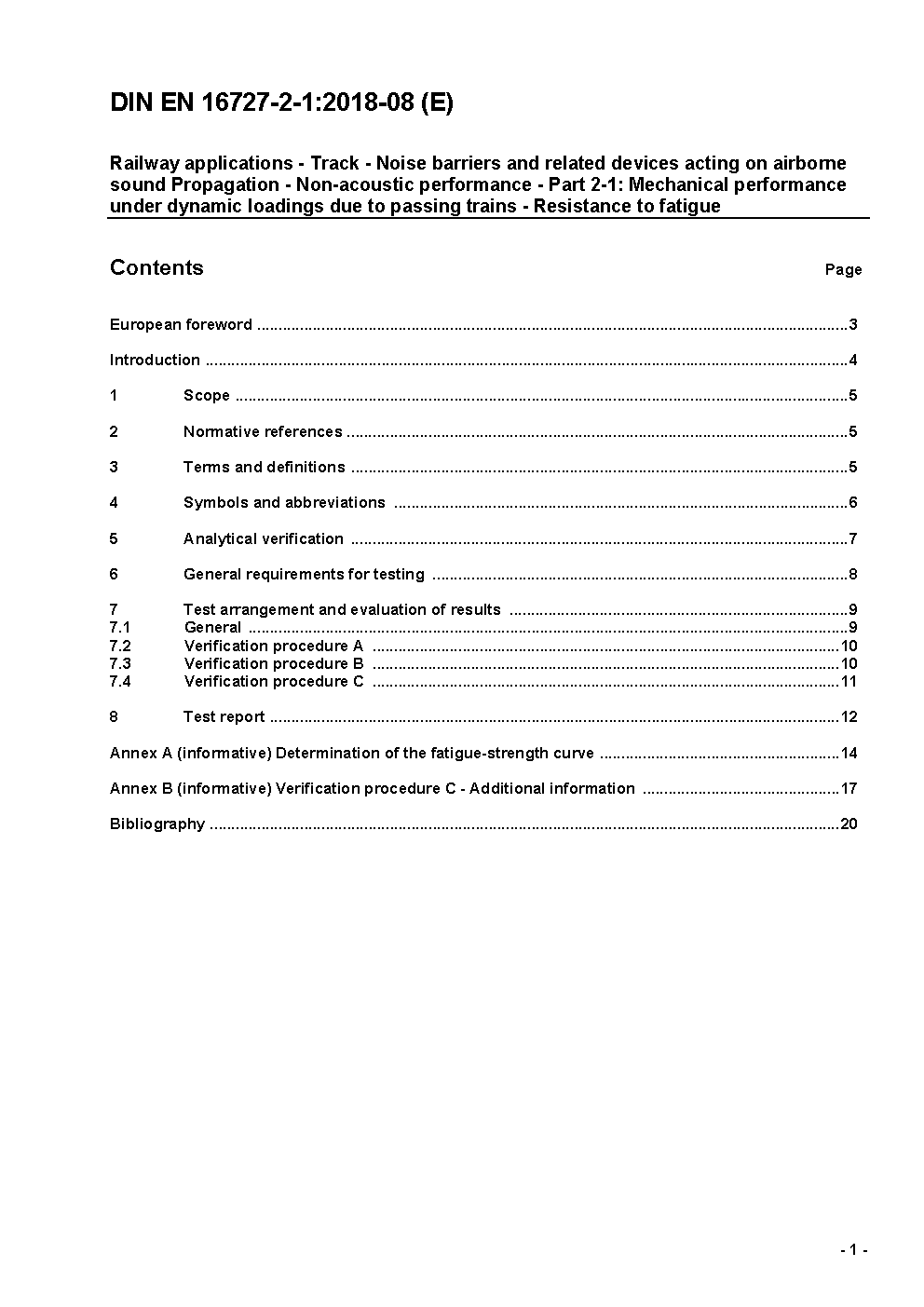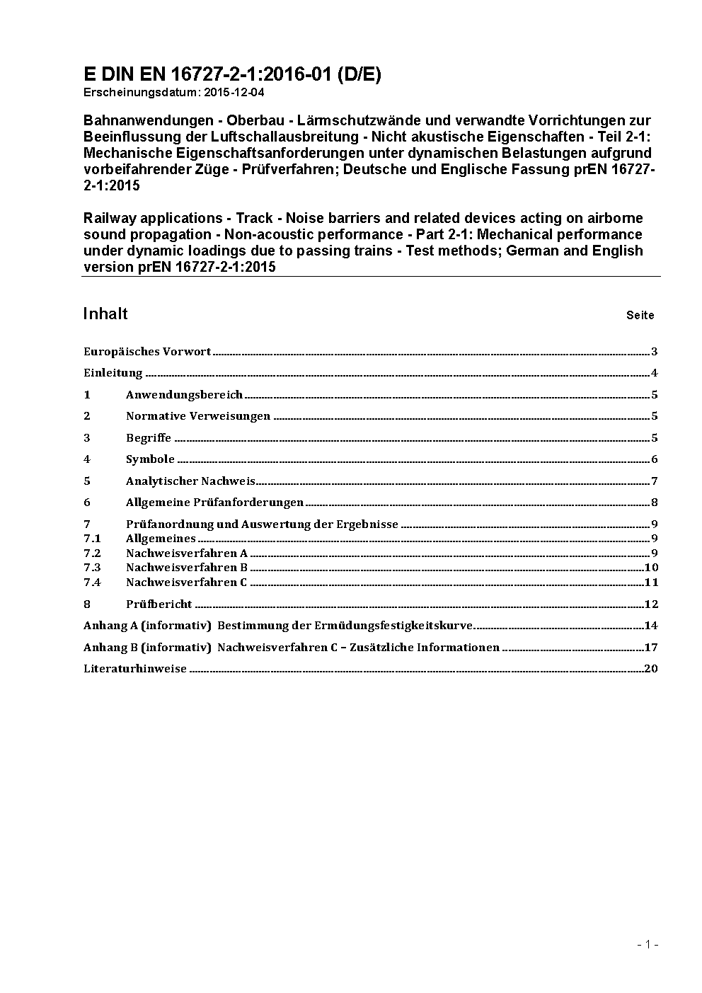 Railway applications - Track - Noise barriers and related devices acting on airborne sound Propagation - Non-acoustic performance - Part 2-1: Mechanical performance under dynamic loadings due to passing trains - Resistance to fatigue; German version EN 16727-2-1:2018