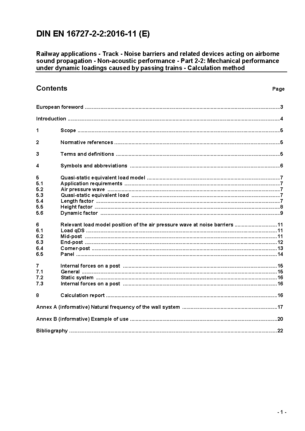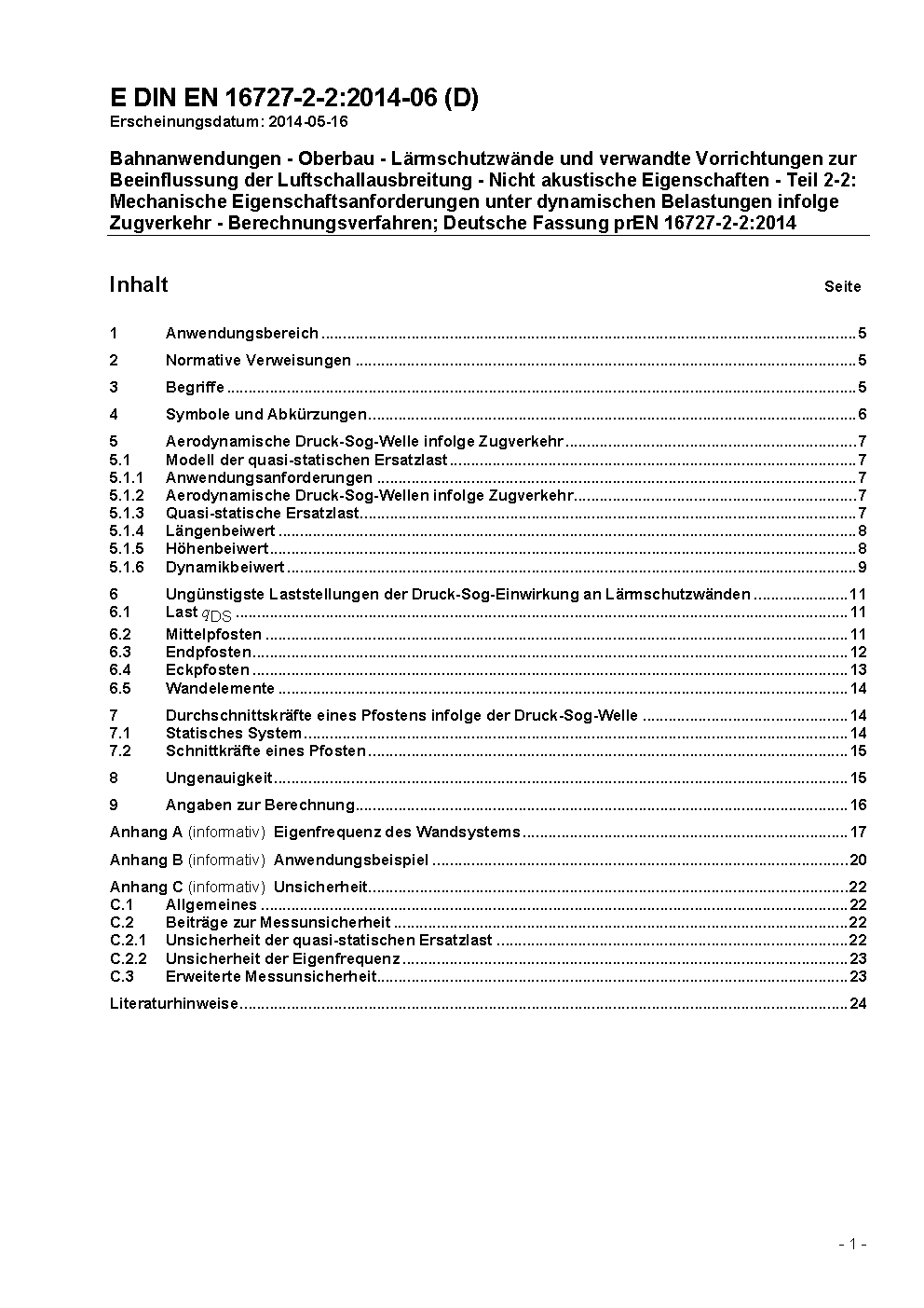 Bahnanwendungen - Oberbau - Lärmschutzwände und verwandte Vorrichtungen zur Beeinflussung der Luftschallausbreitung - Nicht akustische Eigenschaften - Teil 2-2: Mechanische Eigenschaftsanforderungen unter dynamischen Belastungen infolge Zugverkehr - Berechnungsverfahren; Deutsche Fassung prEN 16727-2-2:2014