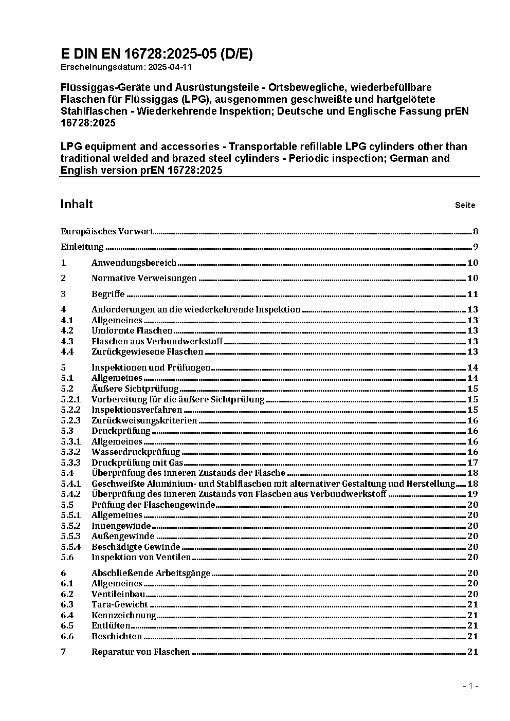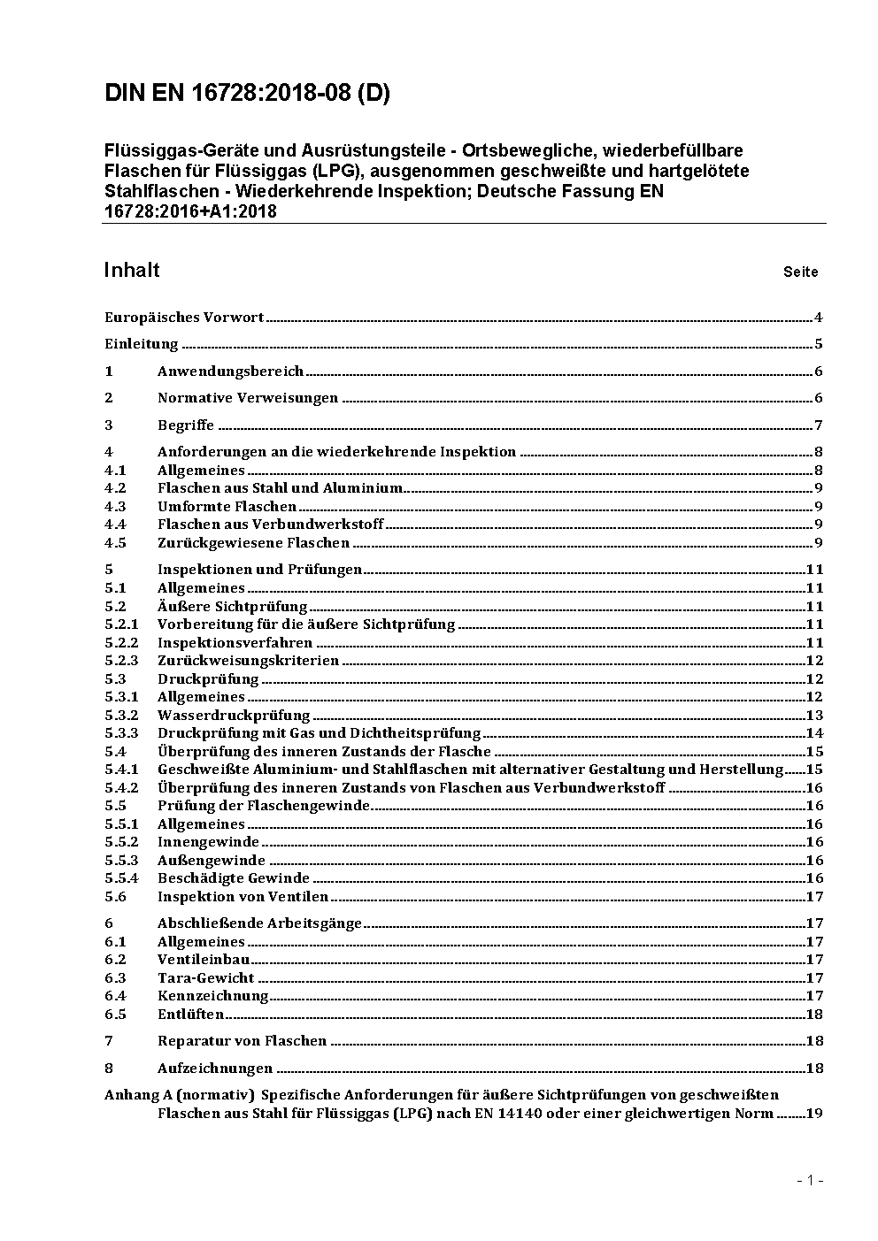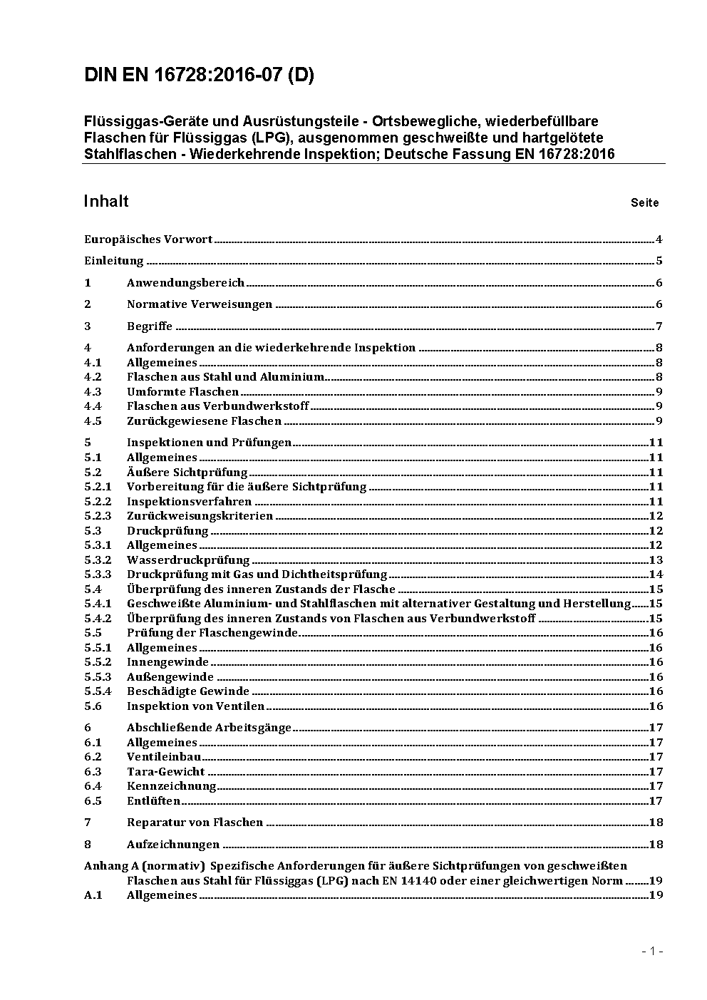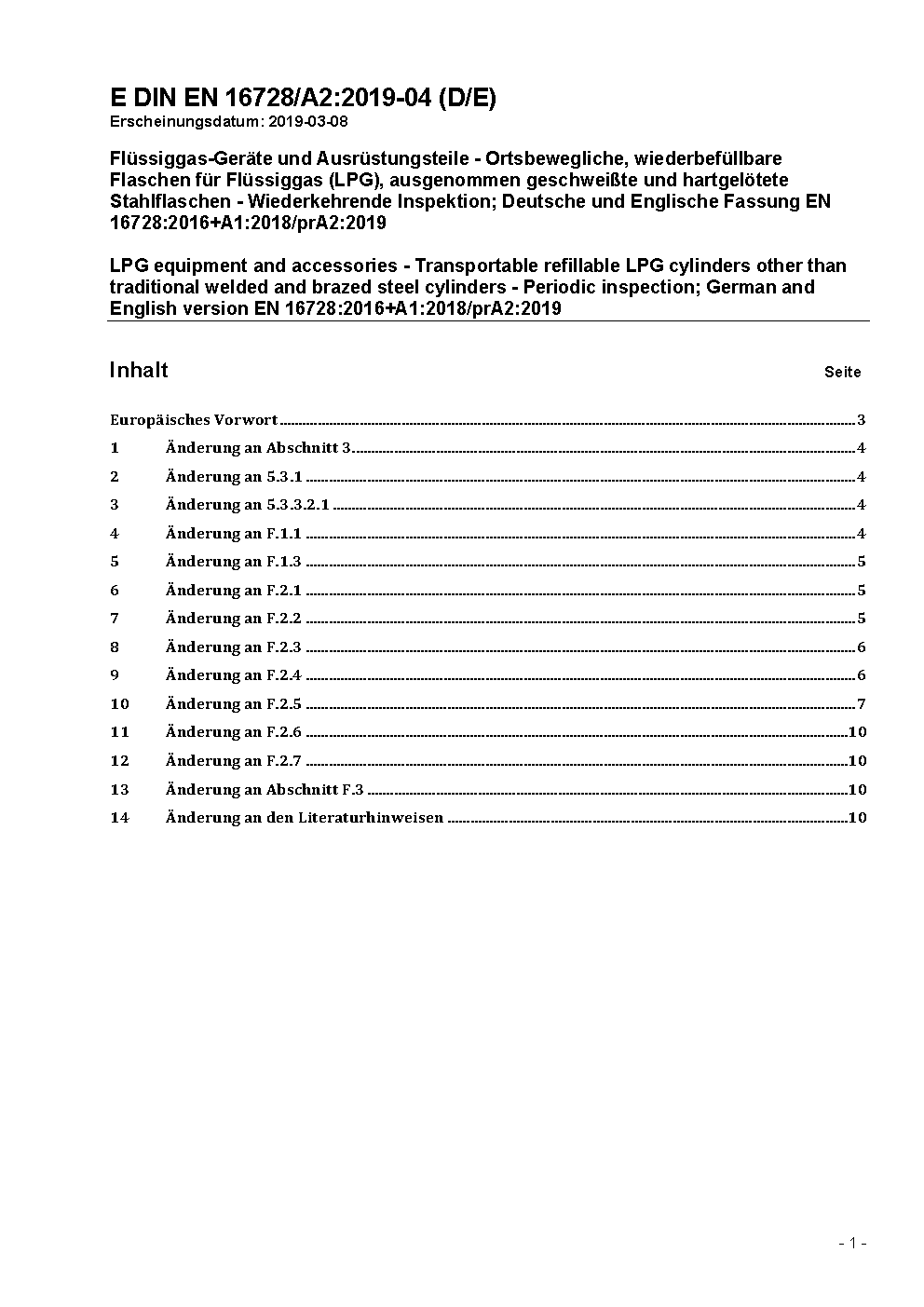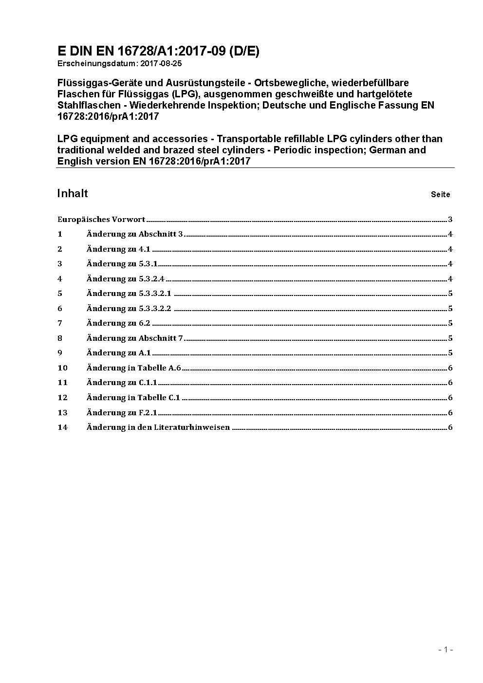 Flüssiggas-Geräte und Ausrüstungsteile - Ortsbewegliche, wiederbefüllbare Flaschen für Flüssiggas (LPG), ausgenommen geschweißte und hartgelötete Stahlflaschen - Wiederkehrende Inspektion; Deutsche und Englische Fassung EN 16728:2016/prA1:2017