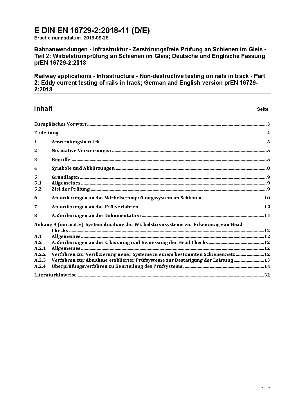 Bahnanwendungen - Infrastruktur - Zerstörungsfreie Prüfung an Schienen im Gleis - Teil 2: Wirbelstromprüfung an Schienen im Gleis; Deutsche und Englische Fassung prEN 16729-2:2018