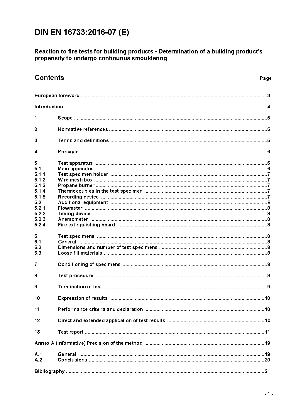 Reaction to fire tests for building products - Determination of a building product's propensity to undergo continuous smouldering; German version prEN 16733:2014