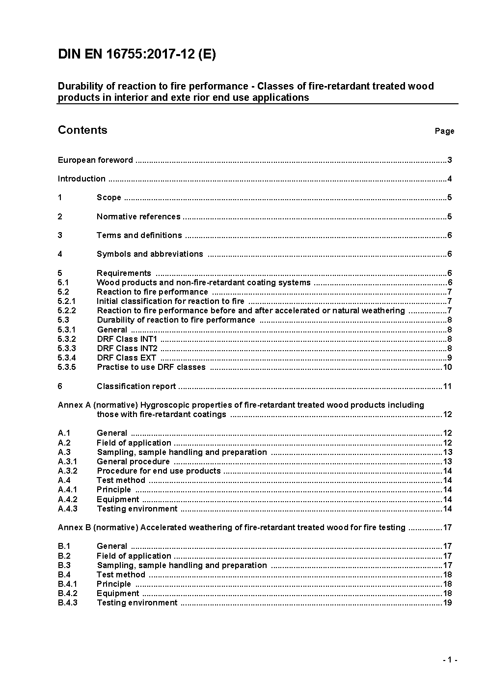 Dauerhaftigkeit des Verhaltens bei Brandeinwirkung - Klassen der mit Feuerschutzmitteln behandelten Holzprodukte für Anwendungen im Innen- und Außenbereich; Deutsche Fassung EN 16755:2017