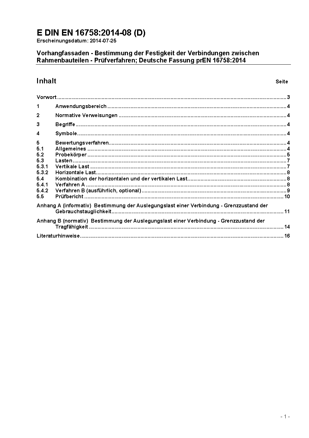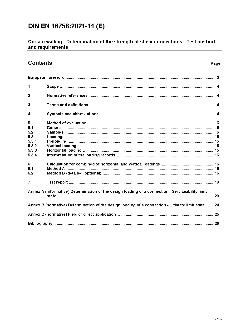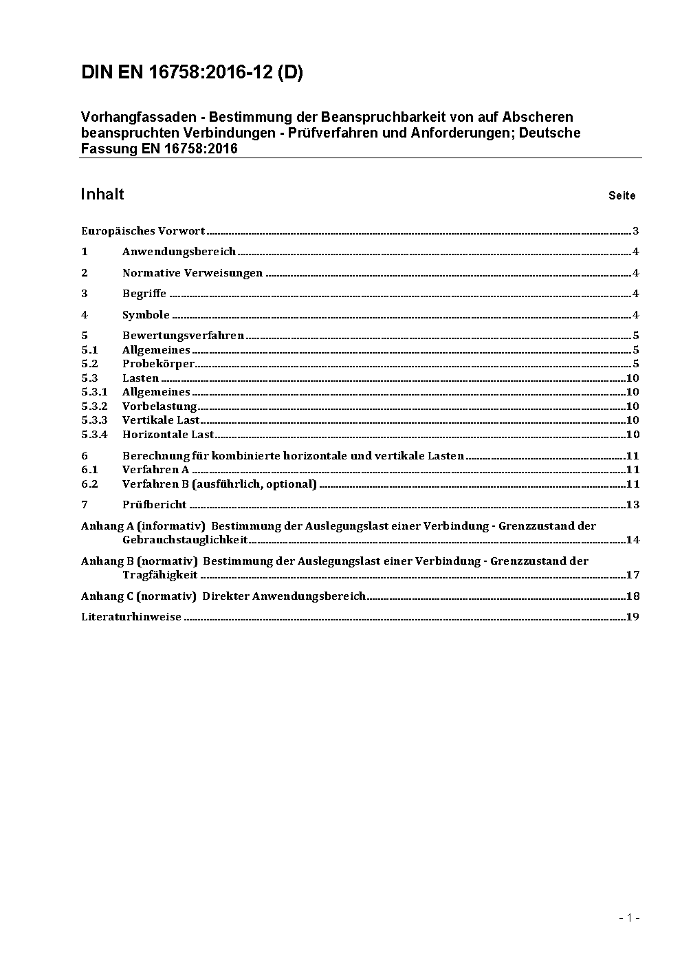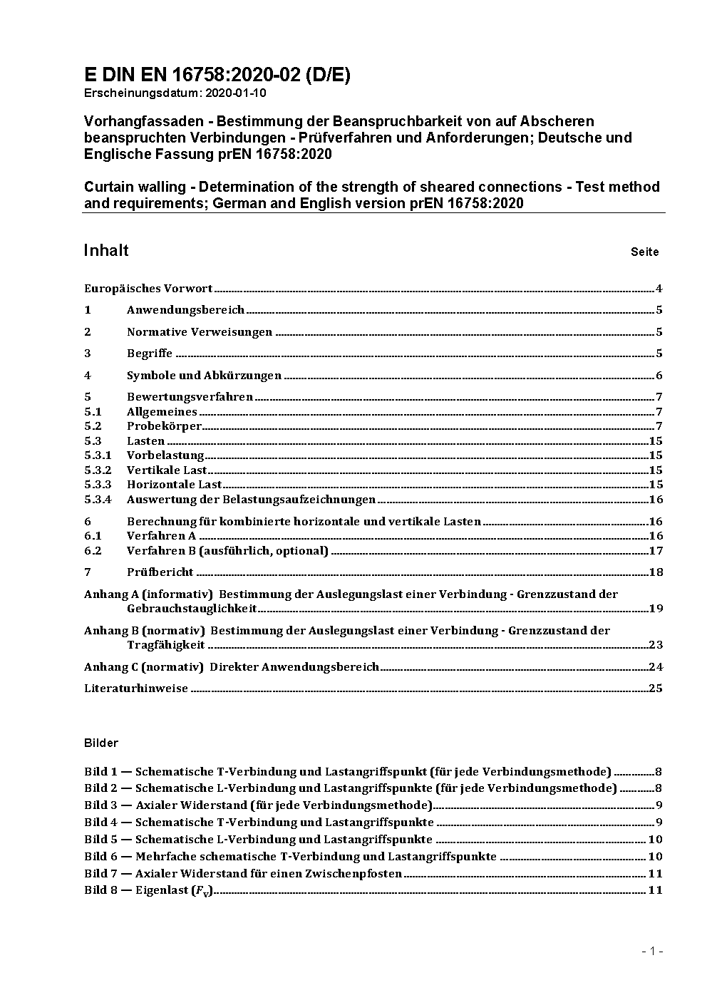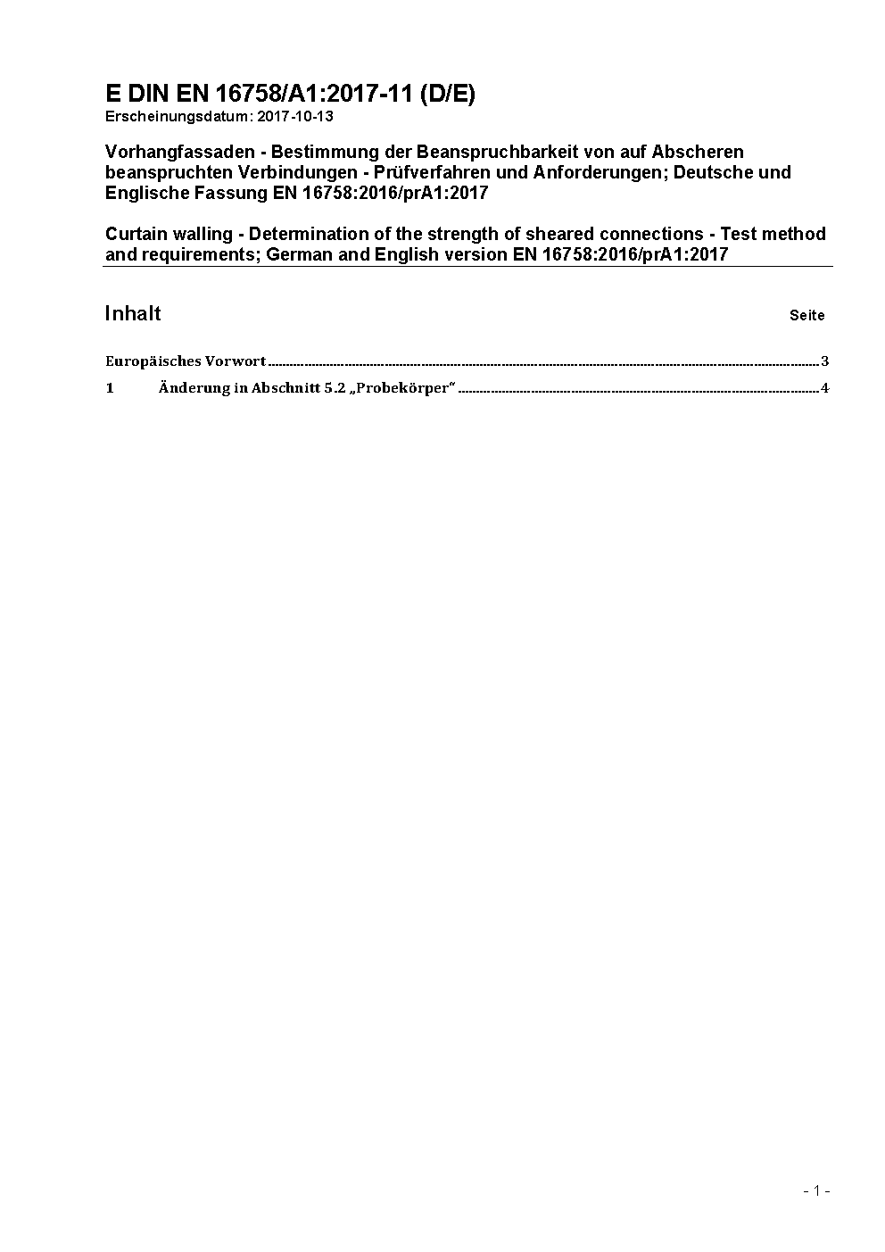 Vorhangfassaden - Bestimmung der Beanspruchbarkeit von auf Abscheren beanspruchten Verbindungen - Prüfverfahren und Anforderungen; Deutsche und Englische Fassung EN 16758:2016/prA1:2017