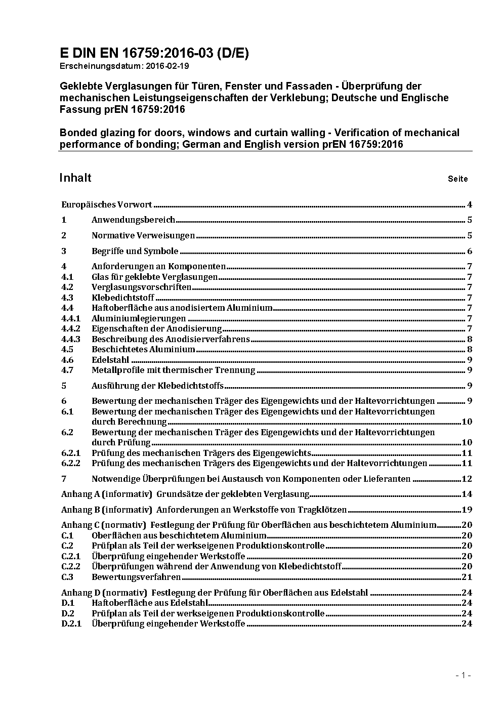 Geklebte Verglasungen (SSGS); Deutsche Fassung prEN 16759:2014