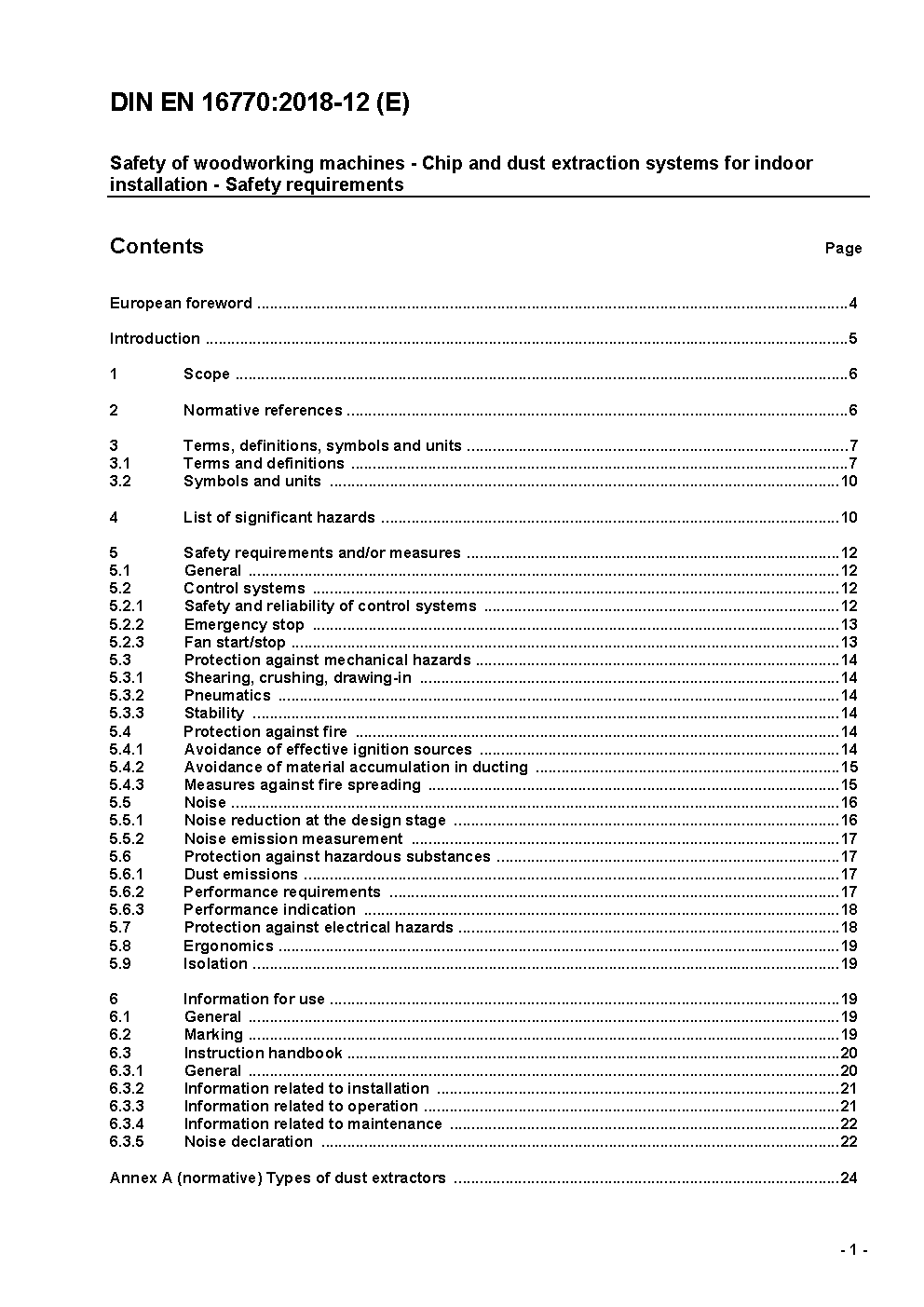 Safety of woodworking machines - Chip and dust extraction systems for indoor installation - Safety requirements; German version prEN 16770:2014