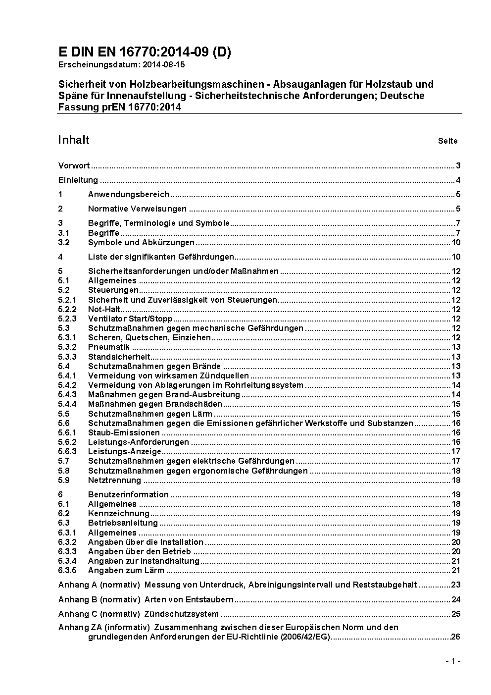 Sicherheit von Holzbearbeitungsmaschinen - Absauganlagen für Holzstaub und Späne für Innenaufstellung - Sicherheitstechnische Anforderungen; Deutsche Fassung prEN 16770:2014