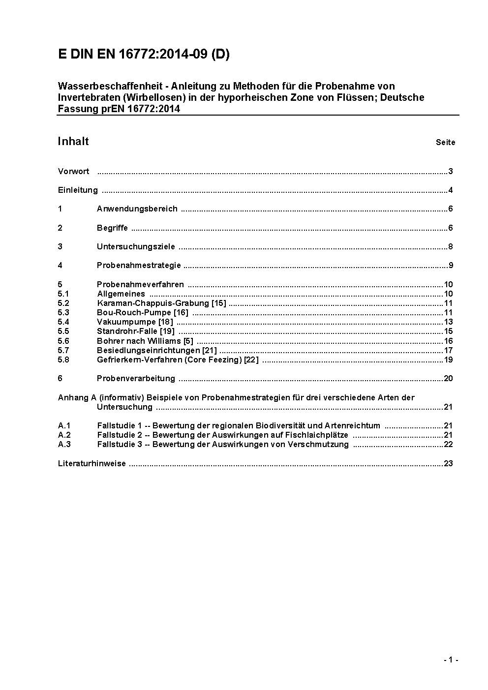Wasserbeschaffenheit - Anleitung zu Methoden für die Probenahme von Invertebraten (Wirbellosen) in der hyporheischen Zone von Flüssen; Deutsche Fassung prEN 16772:2014