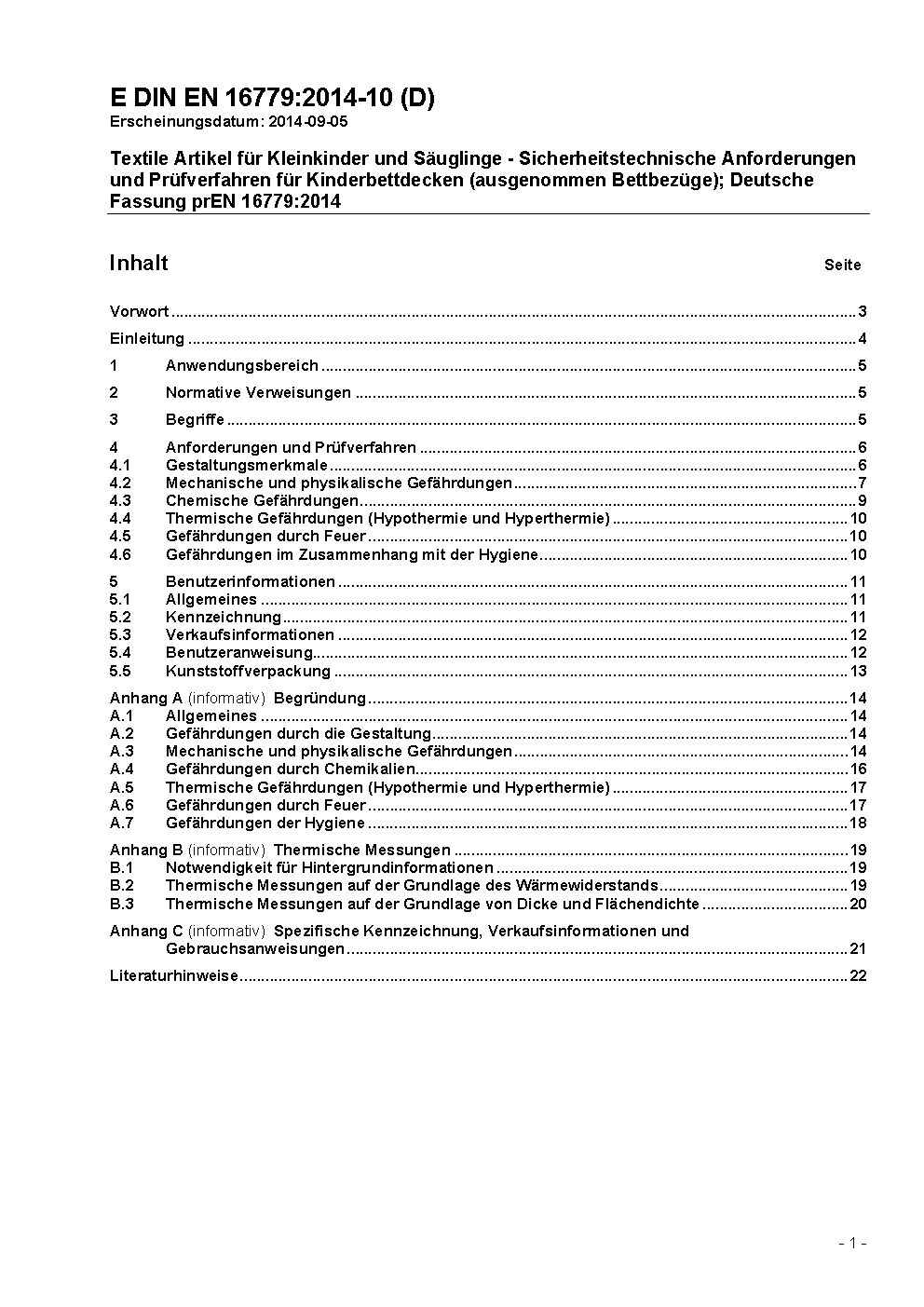 Textile Artikel für Kleinkinder und Säuglinge - Sicherheitstechnische Anforderungen und Prüfverfahren für Kinderbettdecken (ausgenommen Bettbezüge); Deutsche Fassung prEN 16779:2014