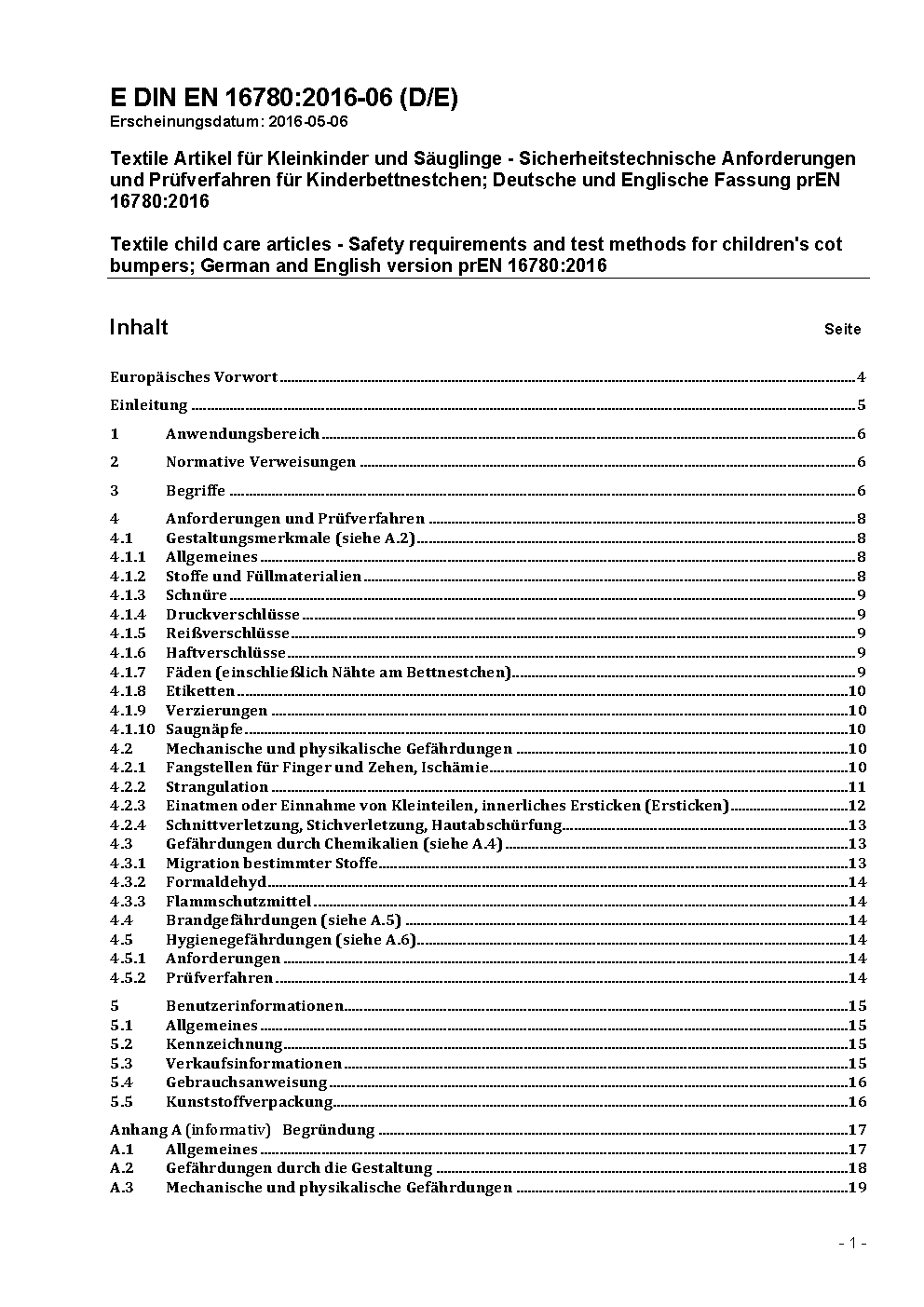 Textile Artikel für Säuglinge und Kleinkinder - Sicherheitstechnische Anforderungen und Prüfverfahren für Kinderbettnestchen; Deutsche Fassung EN 16780:2018