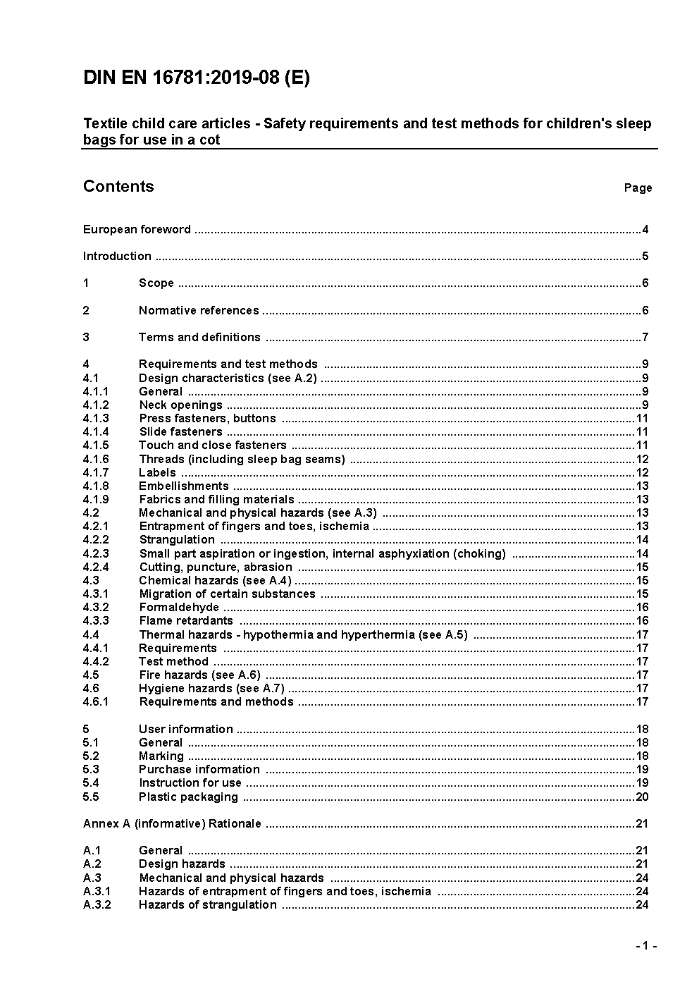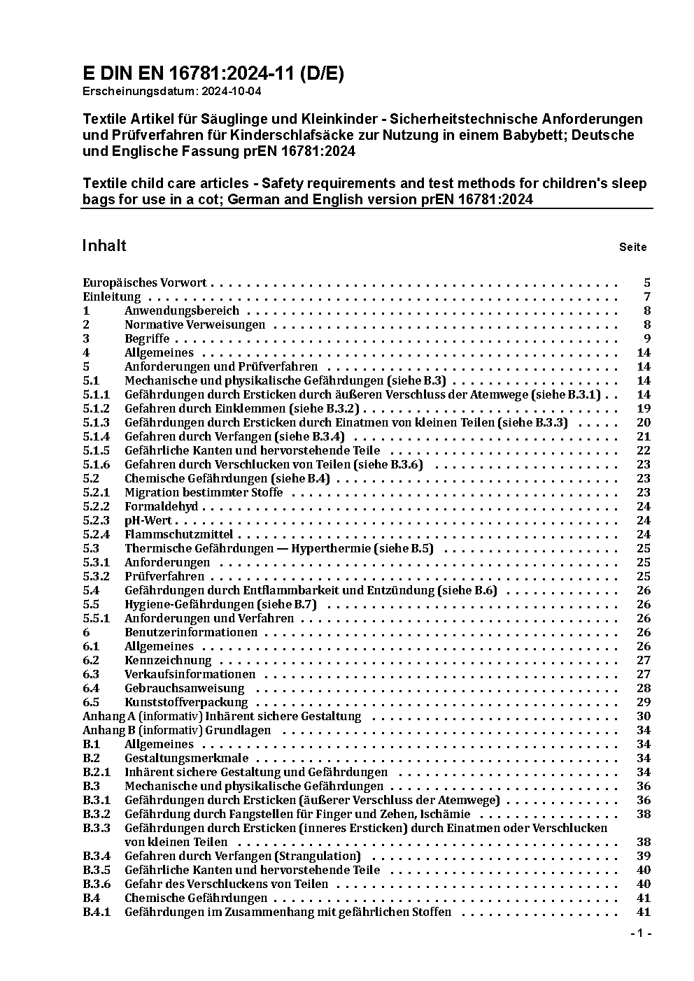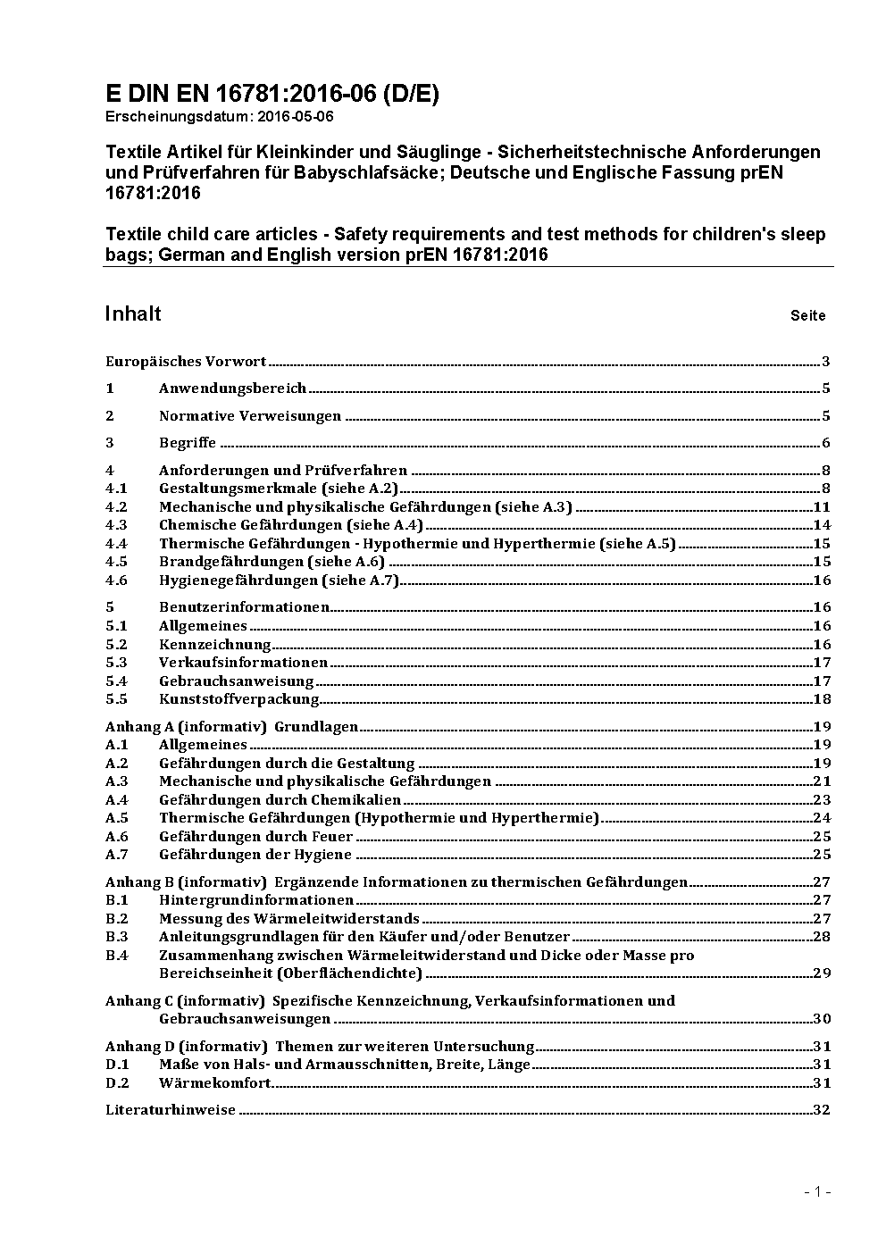 Textile child care articles - Safety requirements and test methods for children's sleep bags; German version prEN 16781:2014