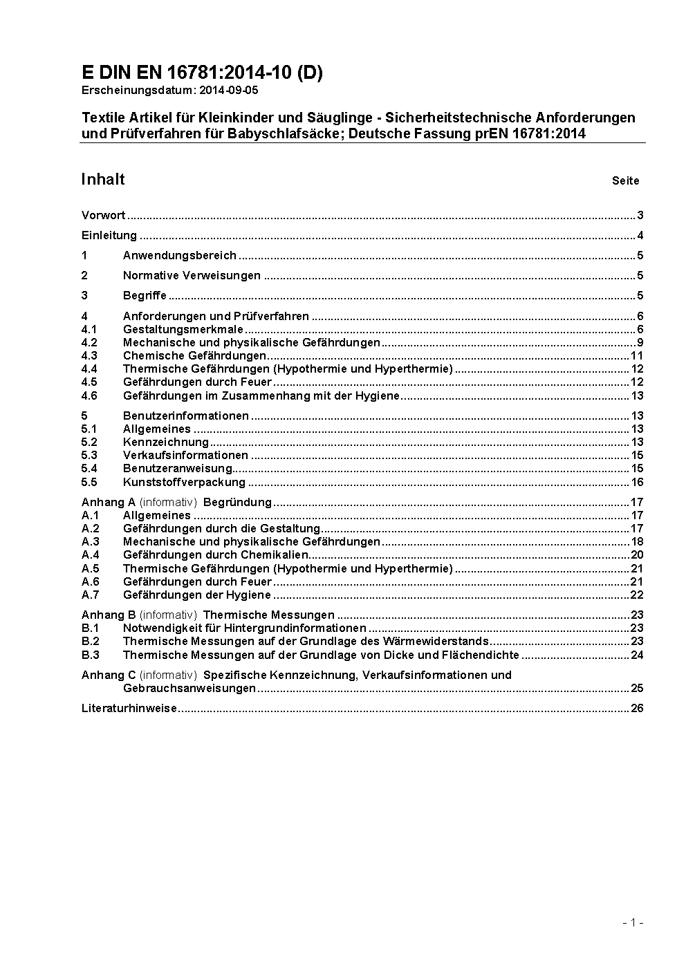 Textile Artikel für Kleinkinder und Säuglinge - Sicherheitstechnische Anforderungen und Prüfverfahren für Babyschlafsäcke; Deutsche Fassung prEN 16781:2014