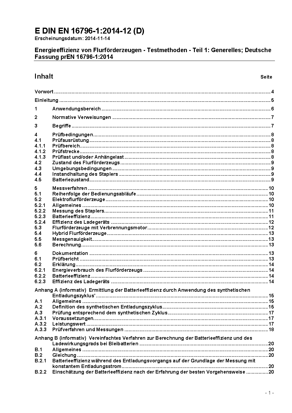 Energieeffizienz von Flurförderzeugen - Testmethoden - Teil 1: Generelles; Deutsche Fassung prEN 16796-1:2014
