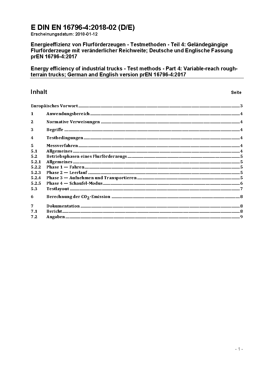 Energy efficiency of industrial trucks - Test methods - Part 4: Variable-reach rough-terrain trucks; German and English version prEN 16796-4:2017.