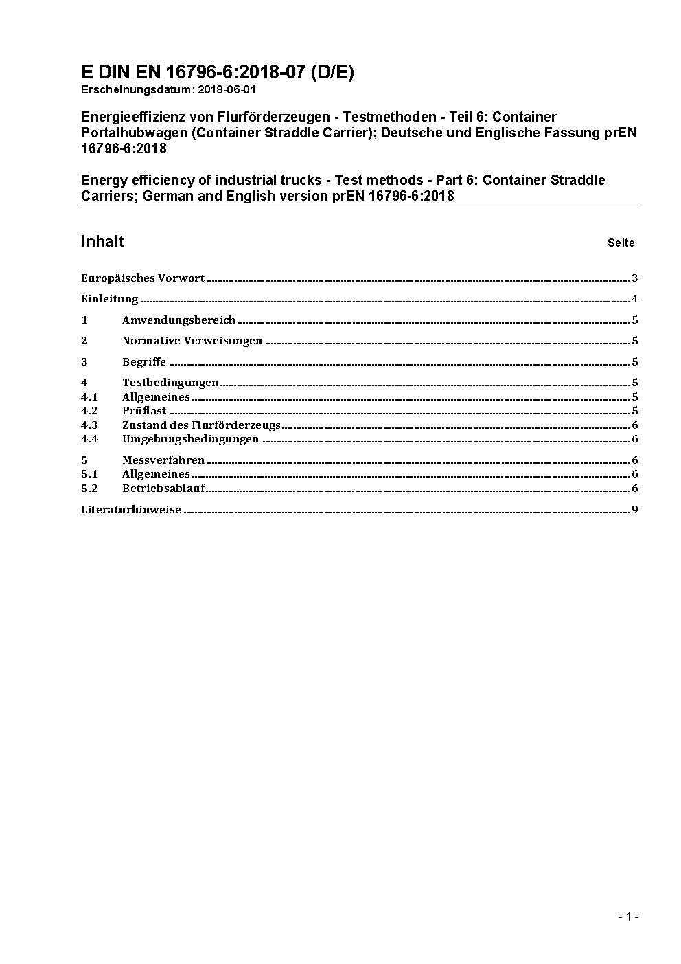 Energy efficiency of industrial trucks - Test methods - Part 6: Container Straddle Carriers; German and English version prEN 16796-6:2018