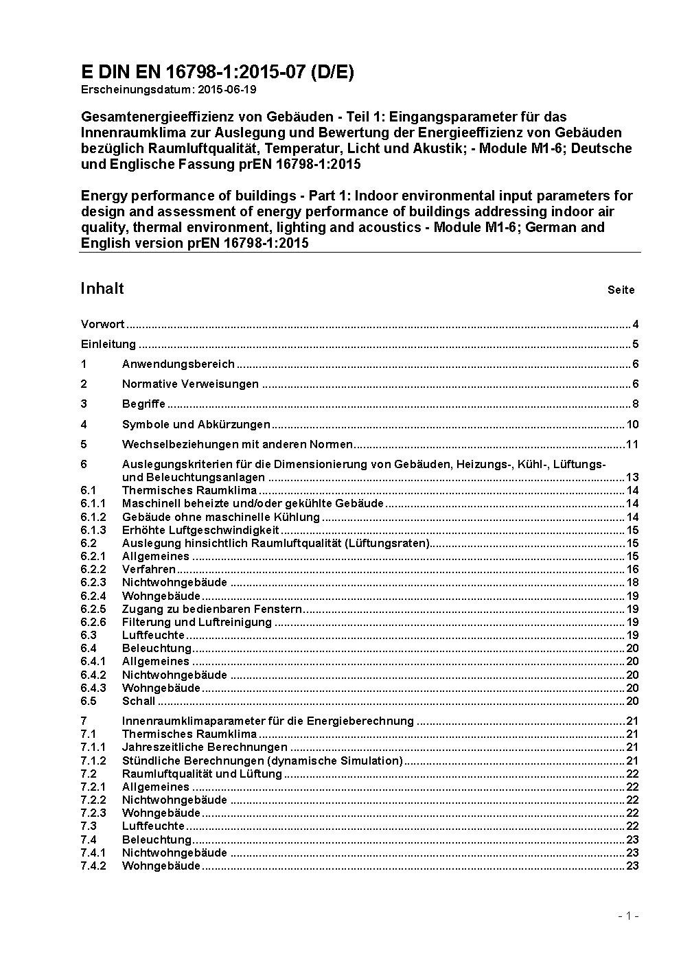 Energetische Bewertung von Gebäuden - Lüftung von Gebäuden - Teil 1: Eingangsparameter für das Innenraumklima zur Auslegung und Bewertung der Energieeffizienz von Gebäuden bezüglich Raumluftqualität, Temperatur, Licht und Akustik - Modul M1-6; Deutsche Fassung EN 16798-1:2019