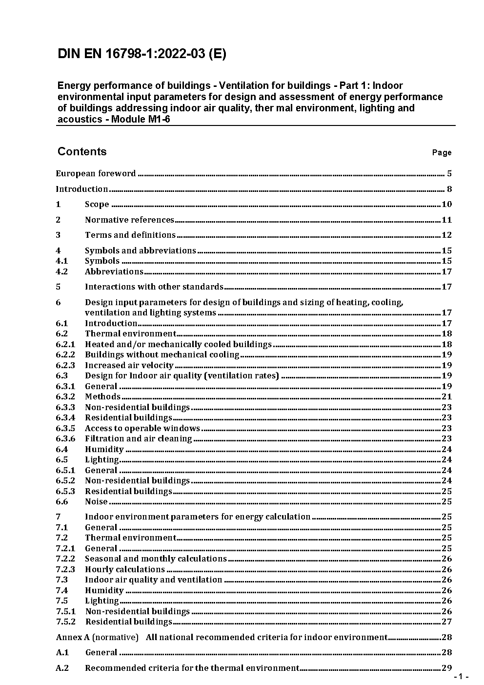 Energy performance of buildings - Ventilation for buildings - Part 1: Indoor environmental input parameters for design and assessment of energy performance of buildings addressing indoor air quality, thermal environment, lighting and acoustics - Module M1-6; German version EN 16798-1:2019