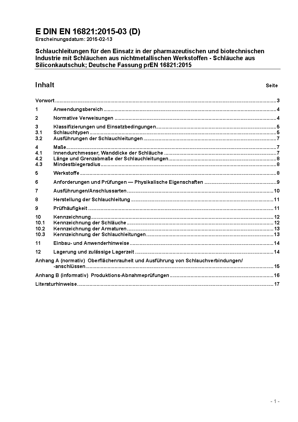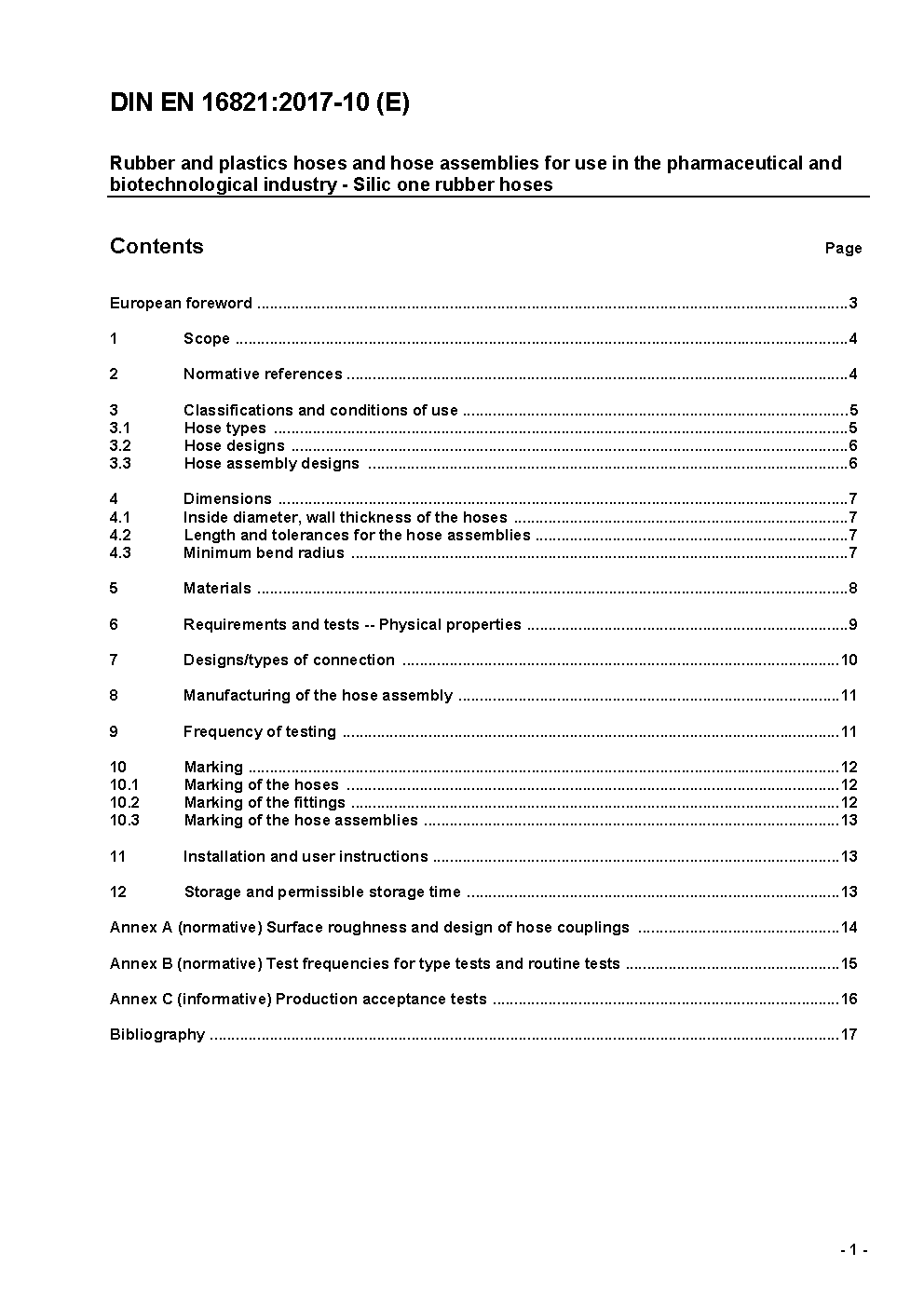 Rubber and plastics hoses and hose assemblies for use in the pharmaceutical and biotechnological industry - Silicone rubber hoses; German version EN 16821:2017