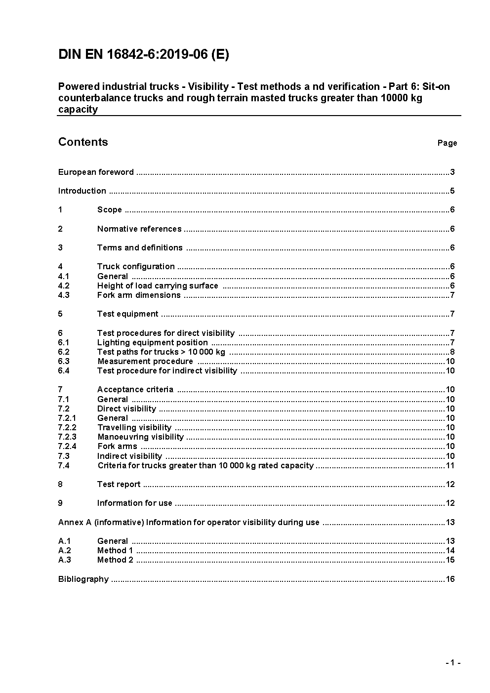 Powered industrial trucks - Visibility - Test methods and verification - Part 6: Sit-on counterbalance trucks and rough terrain masted trucks greater than 10000 kg capacity; German version EN 16842-6:2018.