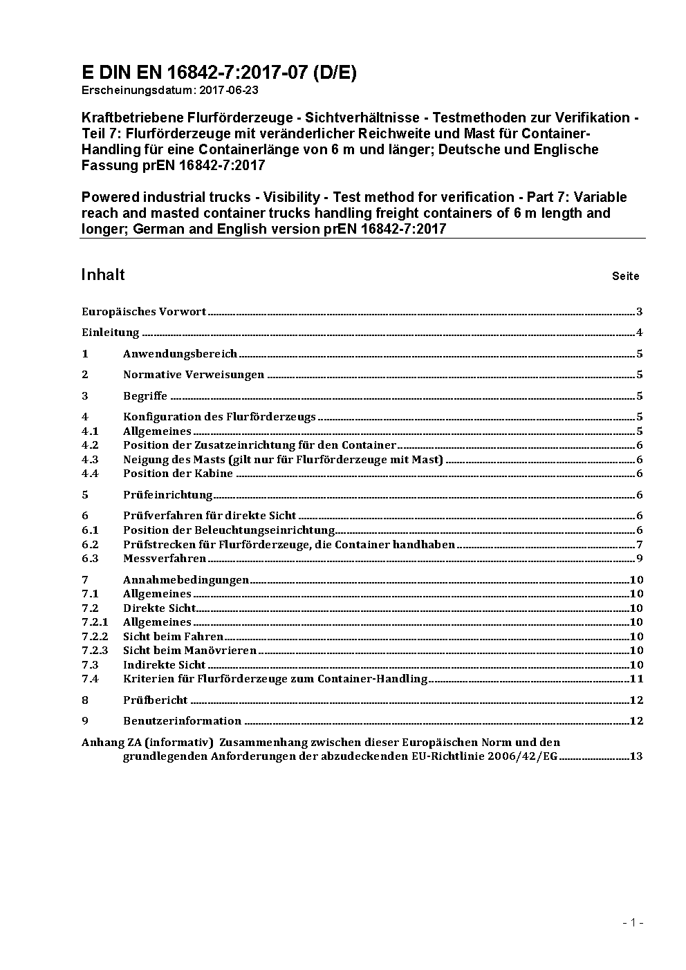 Kraftbetriebene Flurförderzeuge - Sichtverhältnisse - Prüfverfahren und Verifikation - Teil 7: Flurförderzeuge mit veränderlicher Reichweite und Mast für Container-Handling für eine Containerlänge von 6 m (20 ft) und länger; Deutsche Fassung EN 16842-7:2018 / Achtung: Gilt in Verbindung mit DIN EN 16842-1 (2018-10)