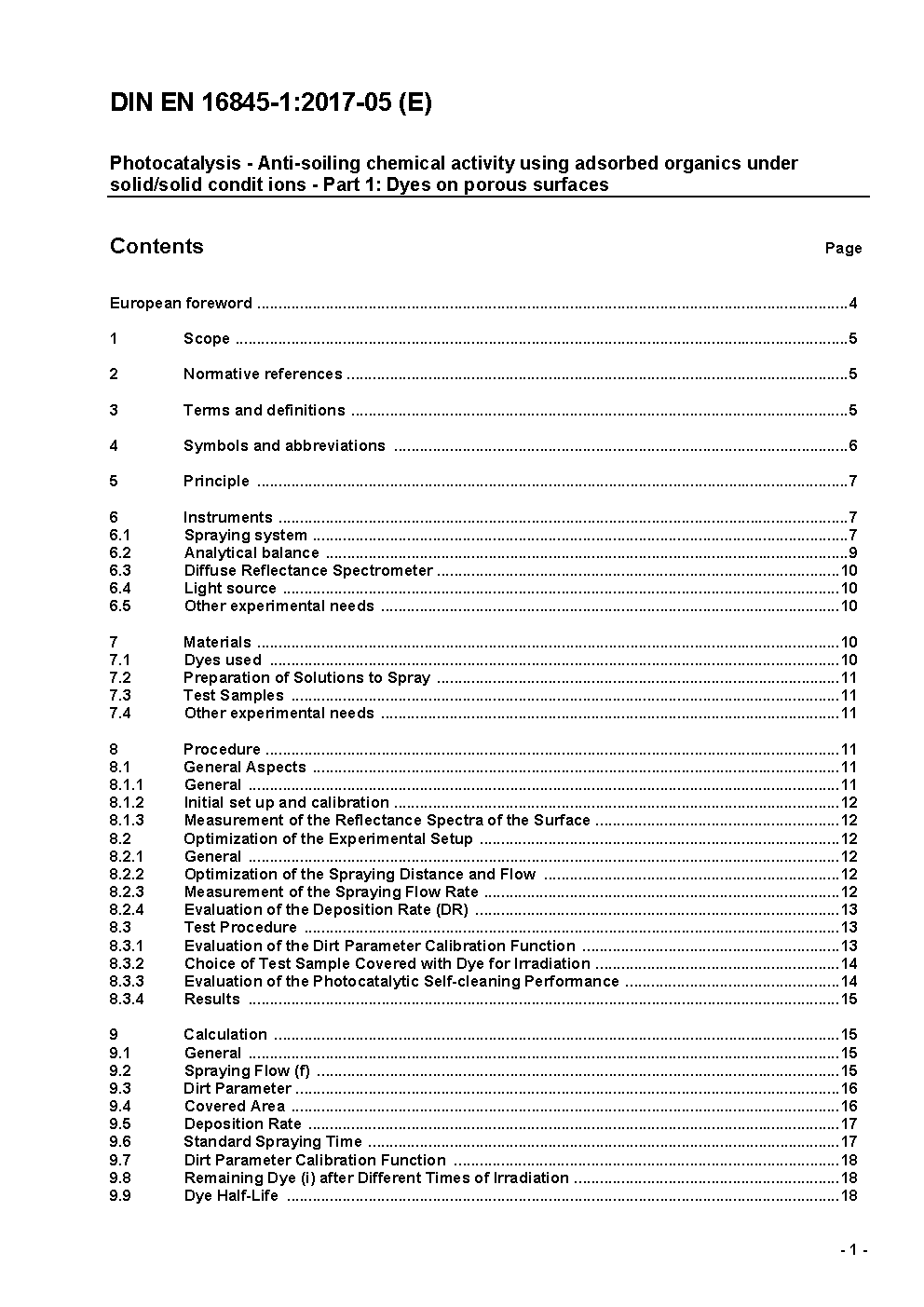 Photokatalyse - Schmutzabweisende chemische Aktivität unter Verwendung adsorbierender organischer Stoffe im Zustand fest/fest - Teil 1: Farbstoffe auf porösen Oberflächen; Deutsche Fassung EN 16845-1:2017
