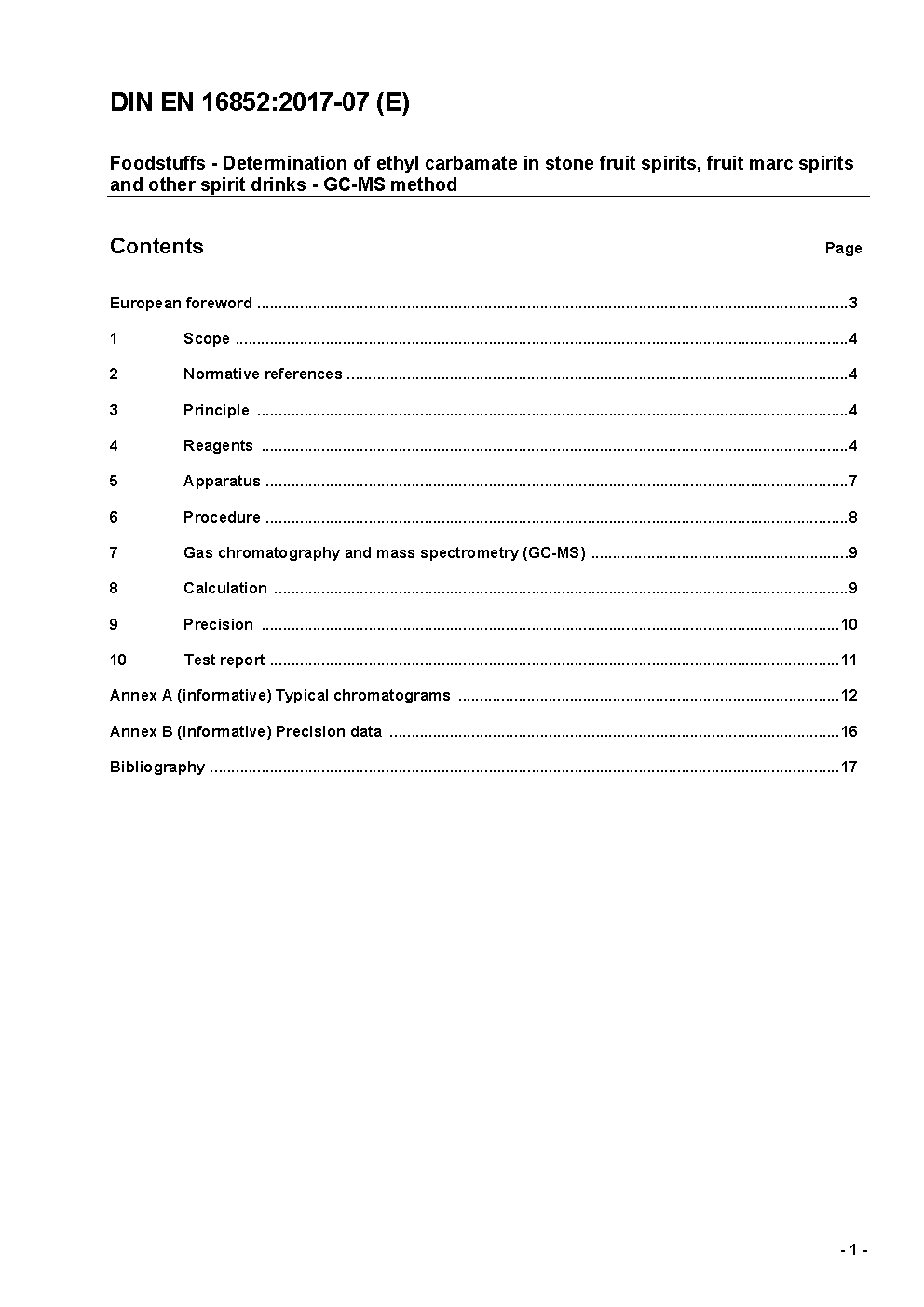 Foodstuffs - Determination of ethyl carbamate in stone fruit spirits, fruit marc spirits and other spirit drinks - GC-MS method; German and English version prEN 16852:2015