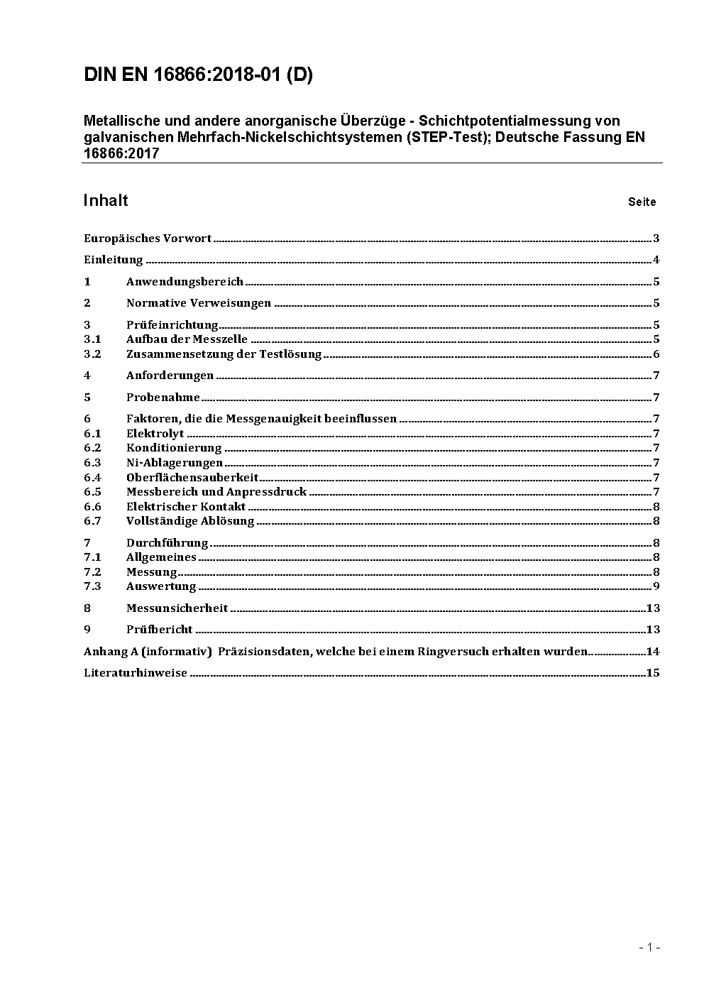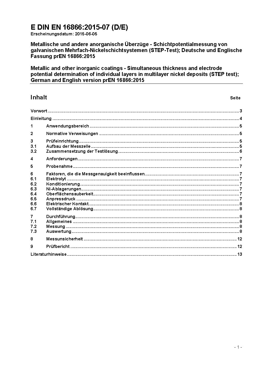 Metallische und andere anorganische Überzüge - Schichtpotentialmessung von galvanischen Mehrfach-Nickelschichtsystemen (STEP-Test); Deutsche und Englische Fassung prEN 16866:2015