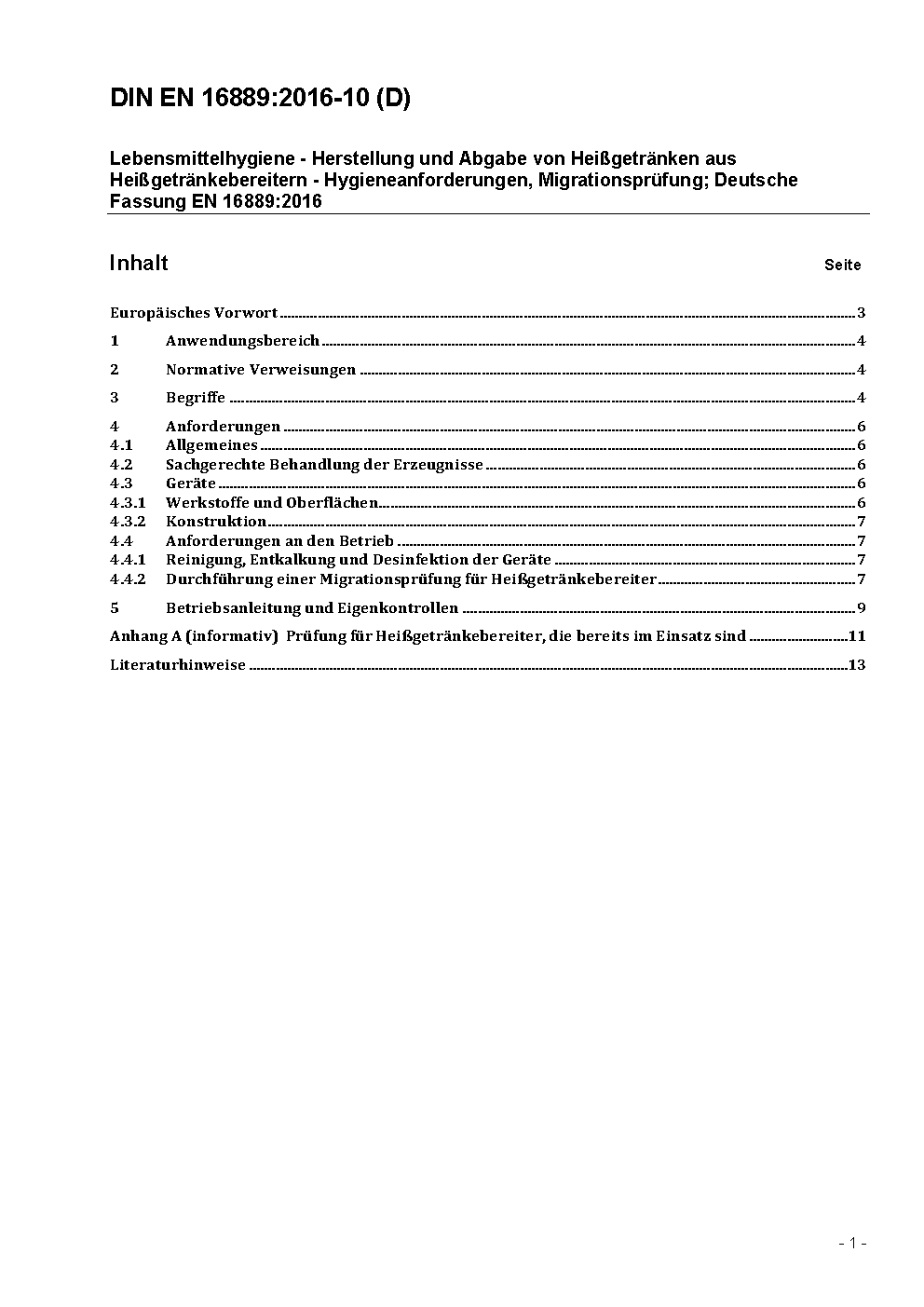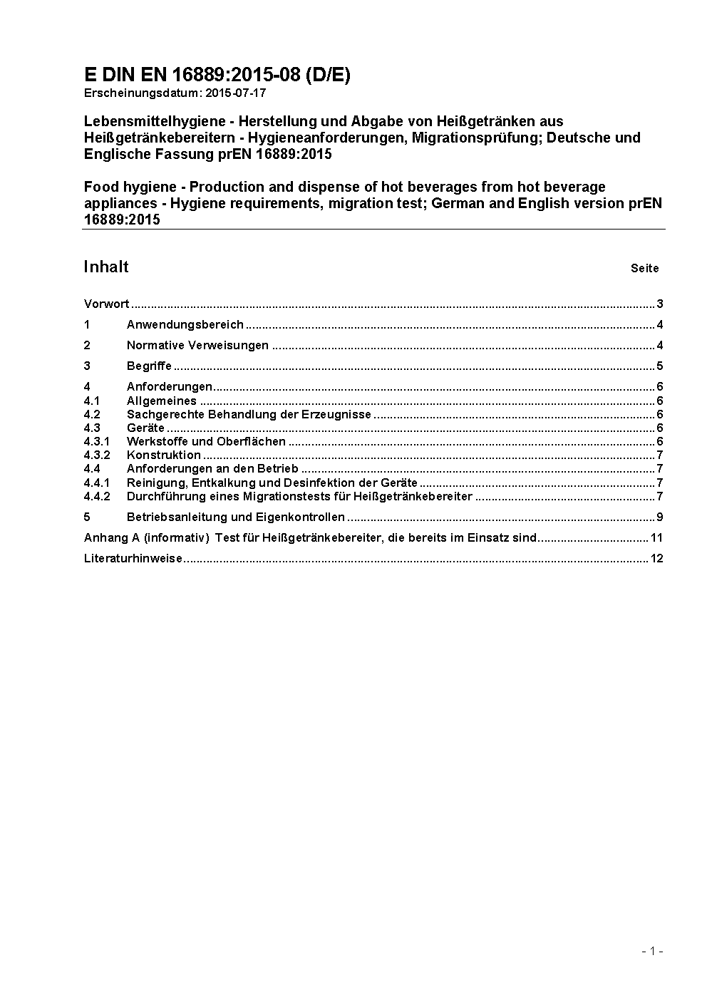 Lebensmittelhygiene - Herstellung und Abgabe von Heißgetränken aus Heißgetränkebereitern - Hygieneanforderungen, Migrationsprüfung; Deutsche Fassung EN 16889:2016