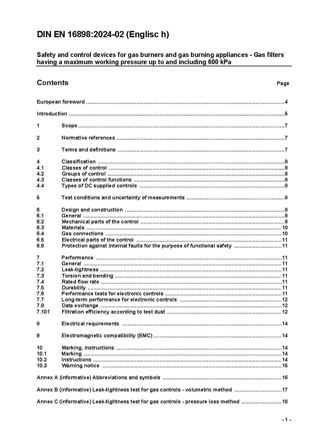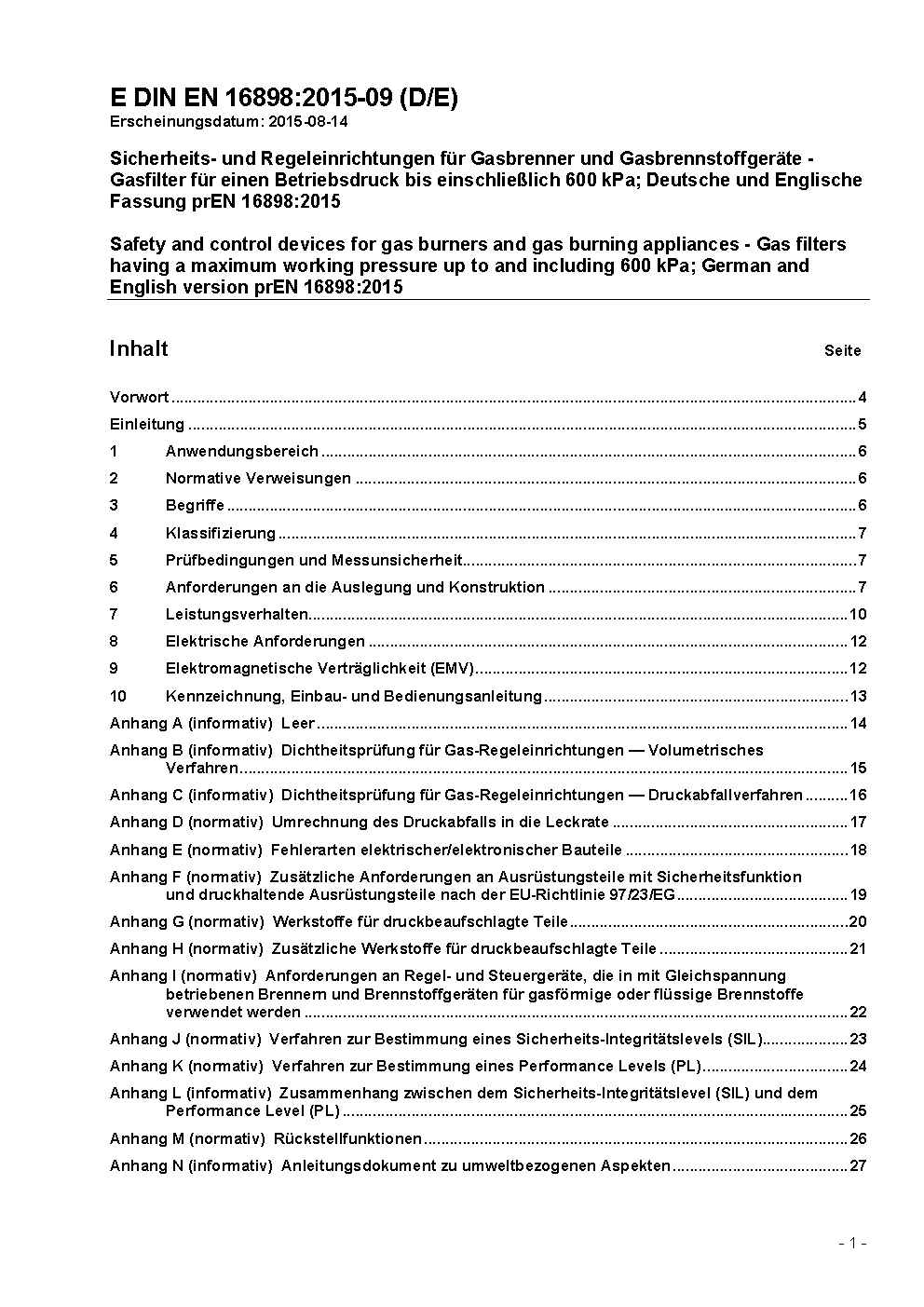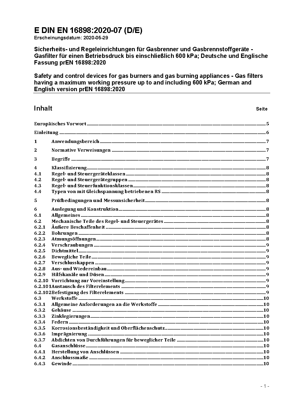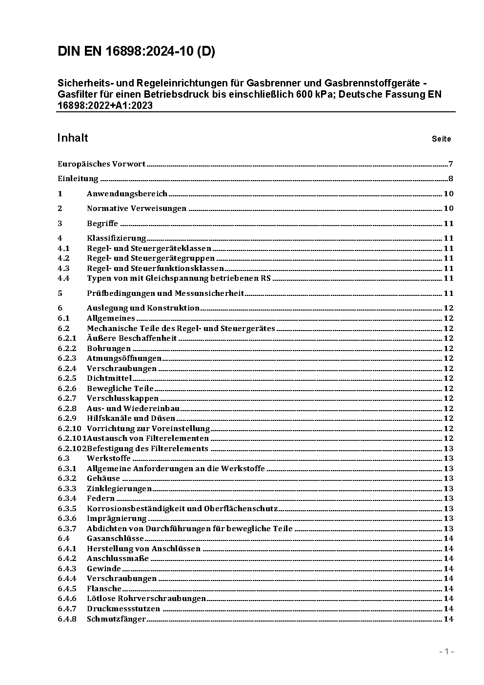 Sicherheits- und Regeleinrichtungen für Gasbrenner und Gasbrennstoffgeräte - Gasfilter für einen Betriebsdruck bis einschließlich 600 kPa; Deutsche Fassung EN 16898:2022 / Achtung: Übergangsfrist, festgelegt durch DIN EN 16898 (2024-10), bis 2025-10-31 beachten.*Gilt in Verbindung mit DIN EN 13611 (2022-01)