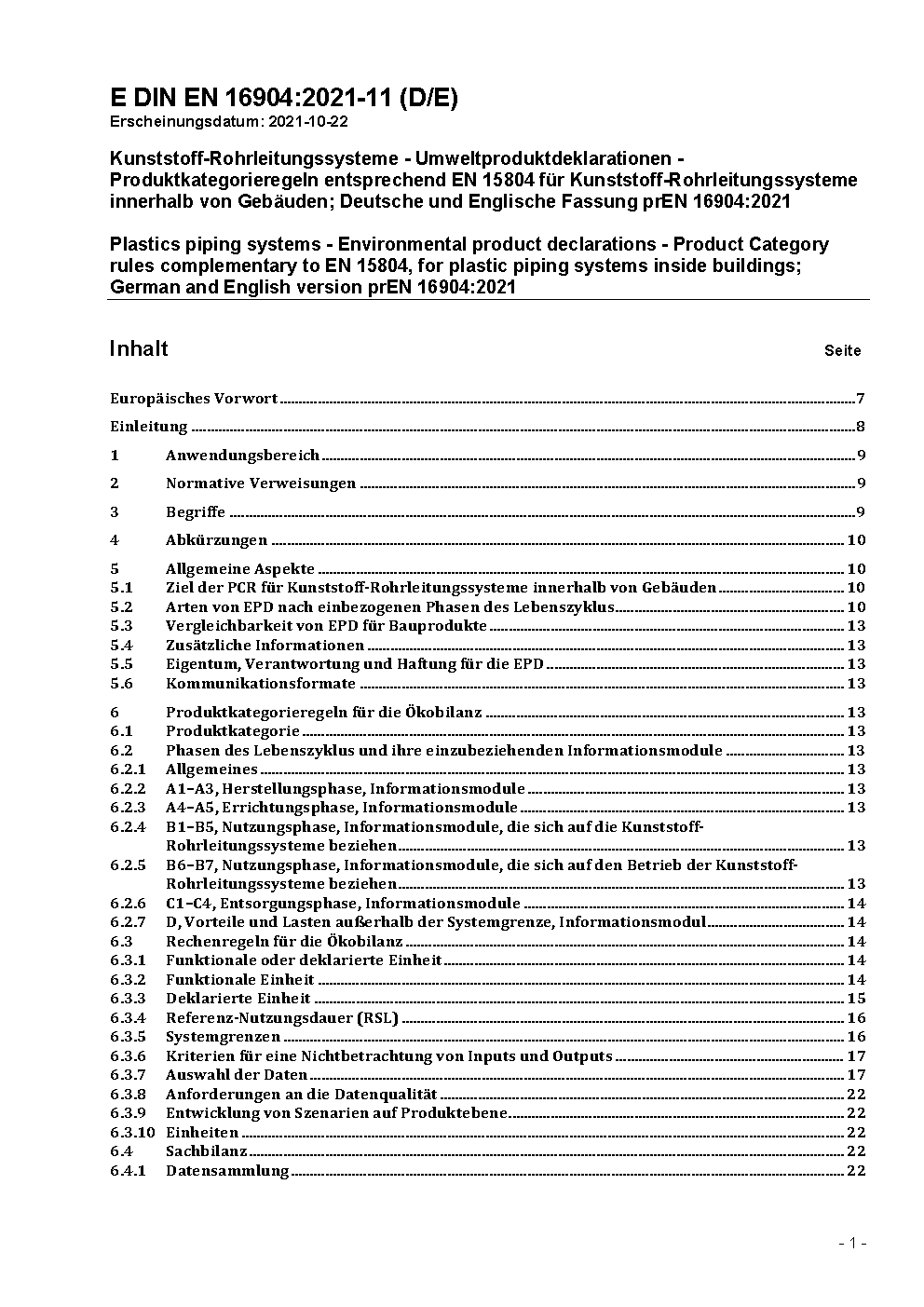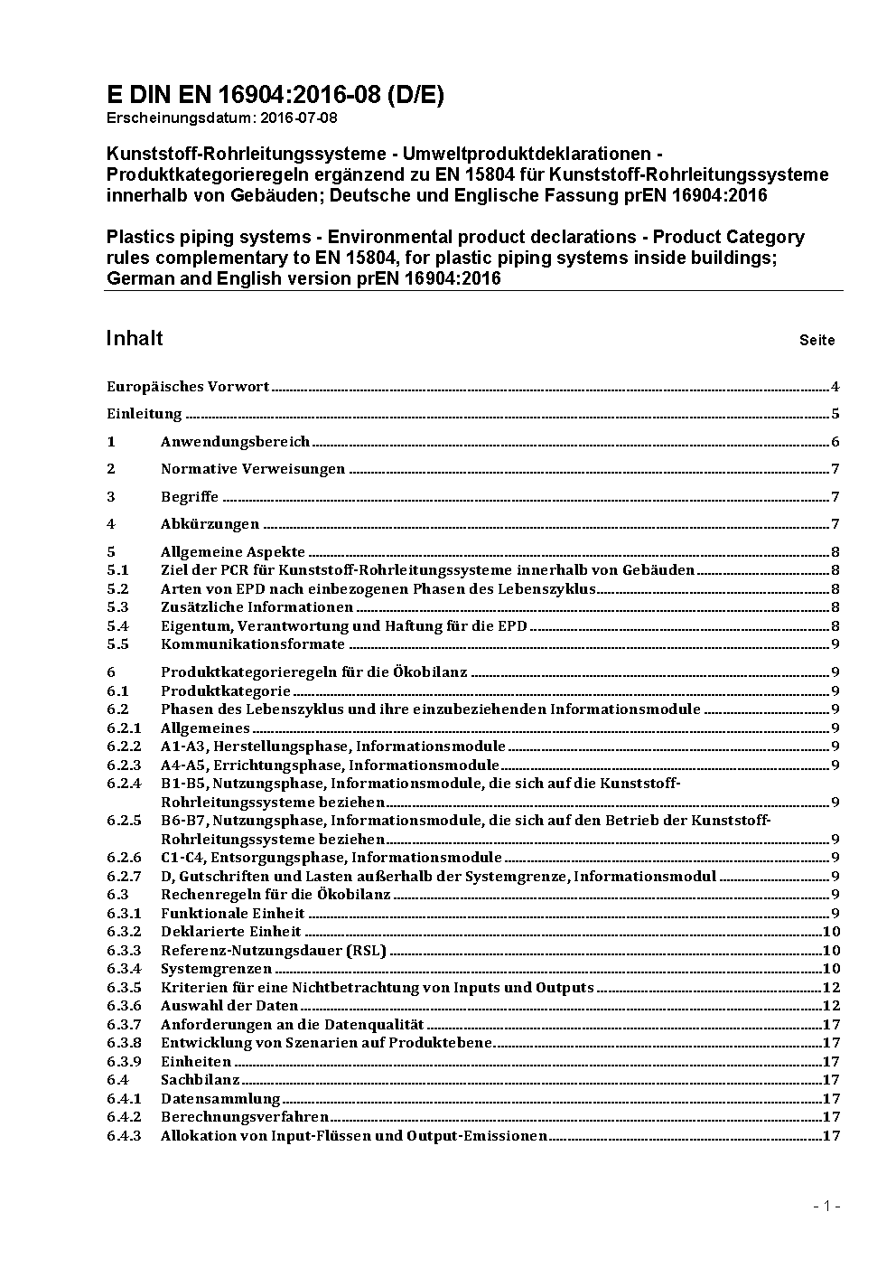 Plastics piping systems - Environmental product declarations - Product Category rules complementary to EN 15804; German and English version prEN 16904:2024