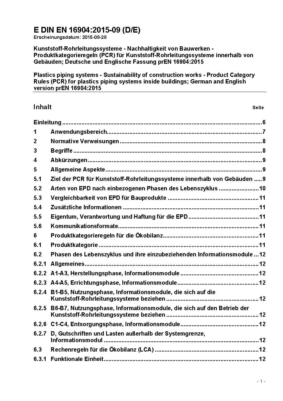 Kunststoff-Rohrleitungssysteme innerhalb der Gebäudestruktur - Umweltproduktdeklarationen - Produktkategorieregeln entsprechend EN 15804; Deutsche und Englische Fassung prEN 16904:2024